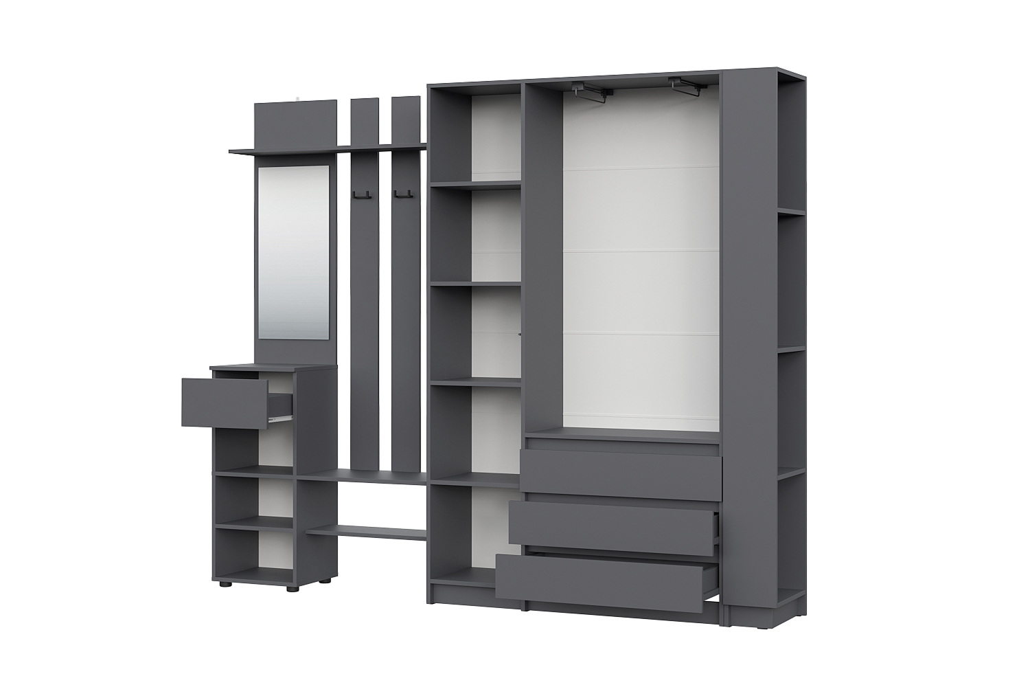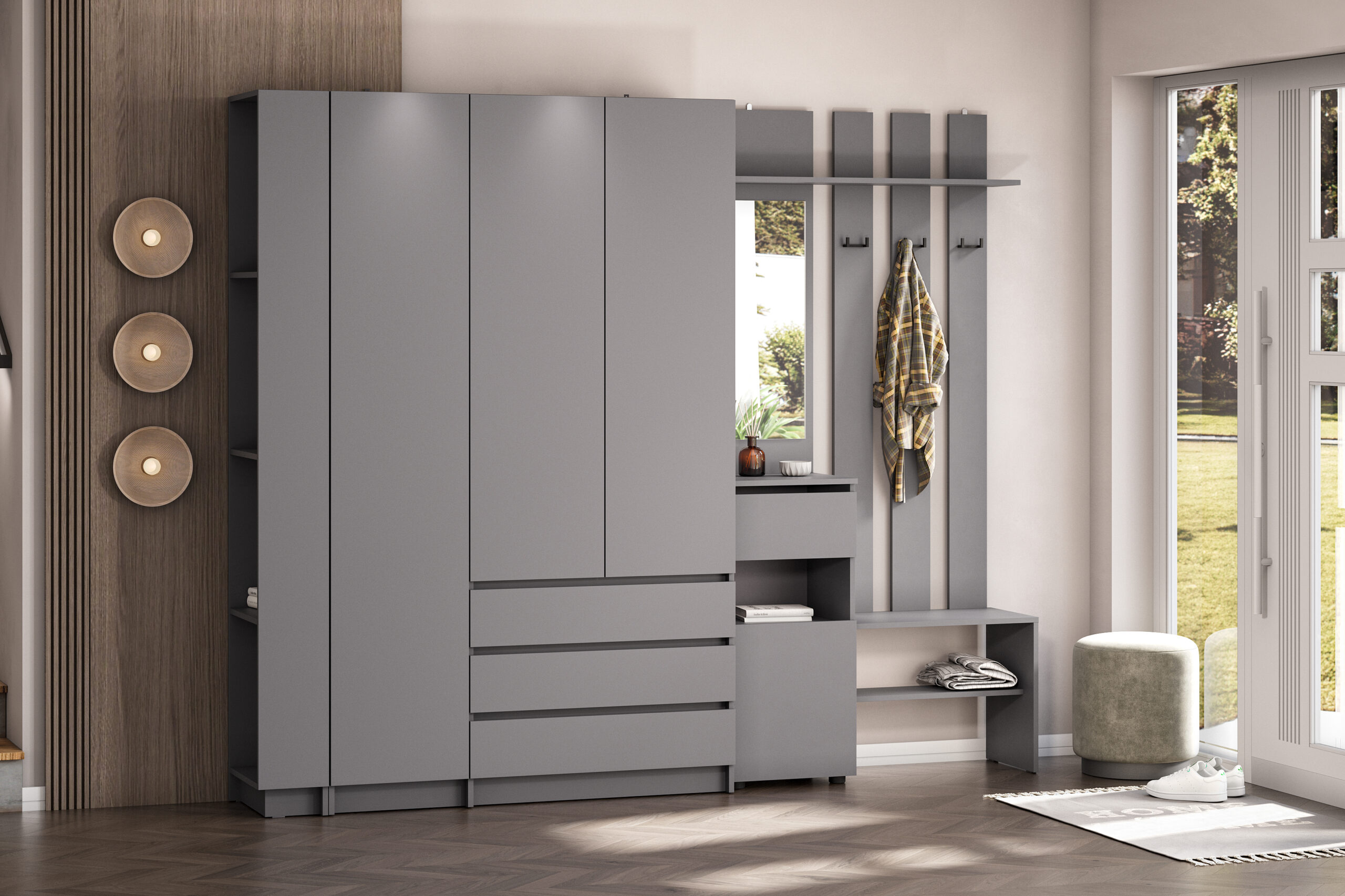 Просторная и светлая прихожая Бали создаст приятное первое впечатление при входе в квартиру. Здесь достаточно места для хранения верхней одежды, обуви и аксессуаров — предусмотрены шкафы и удобные полки. Прихожая в цвете «графит» подойдёт под любой стиль интерьера, а качественные материалы обеспечивают долговечность и лёгкость в уходе. Это пространство идеально подойдёт для тех, кто ценит чистоту, порядок и функциональность с первых шагов в доме.