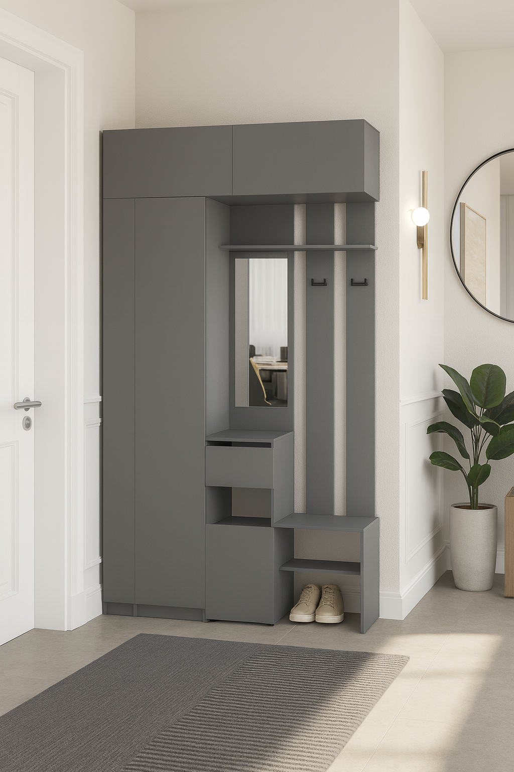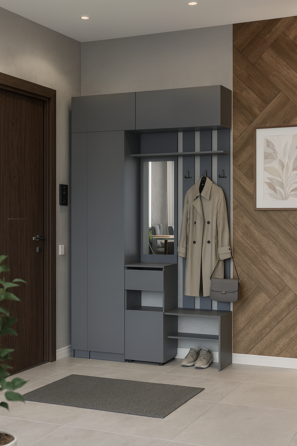 Просторная и светлая прихожая Бали создаст приятное первое впечатление при входе в квартиру. Здесь достаточно места для хранения верхней одежды, обуви и аксессуаров — предусмотрены шкафы и удобные полки. Прихожая в цвете «графит» подойдёт под любой стиль интерьера, а качественные материалы обеспечивают долговечность и лёгкость в уходе. Это пространство идеально подойдёт для тех, кто ценит чистоту, порядок и функциональность с первых шагов в доме.