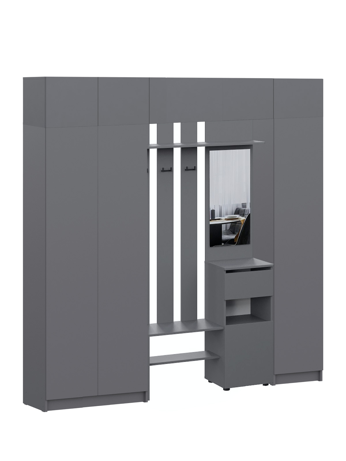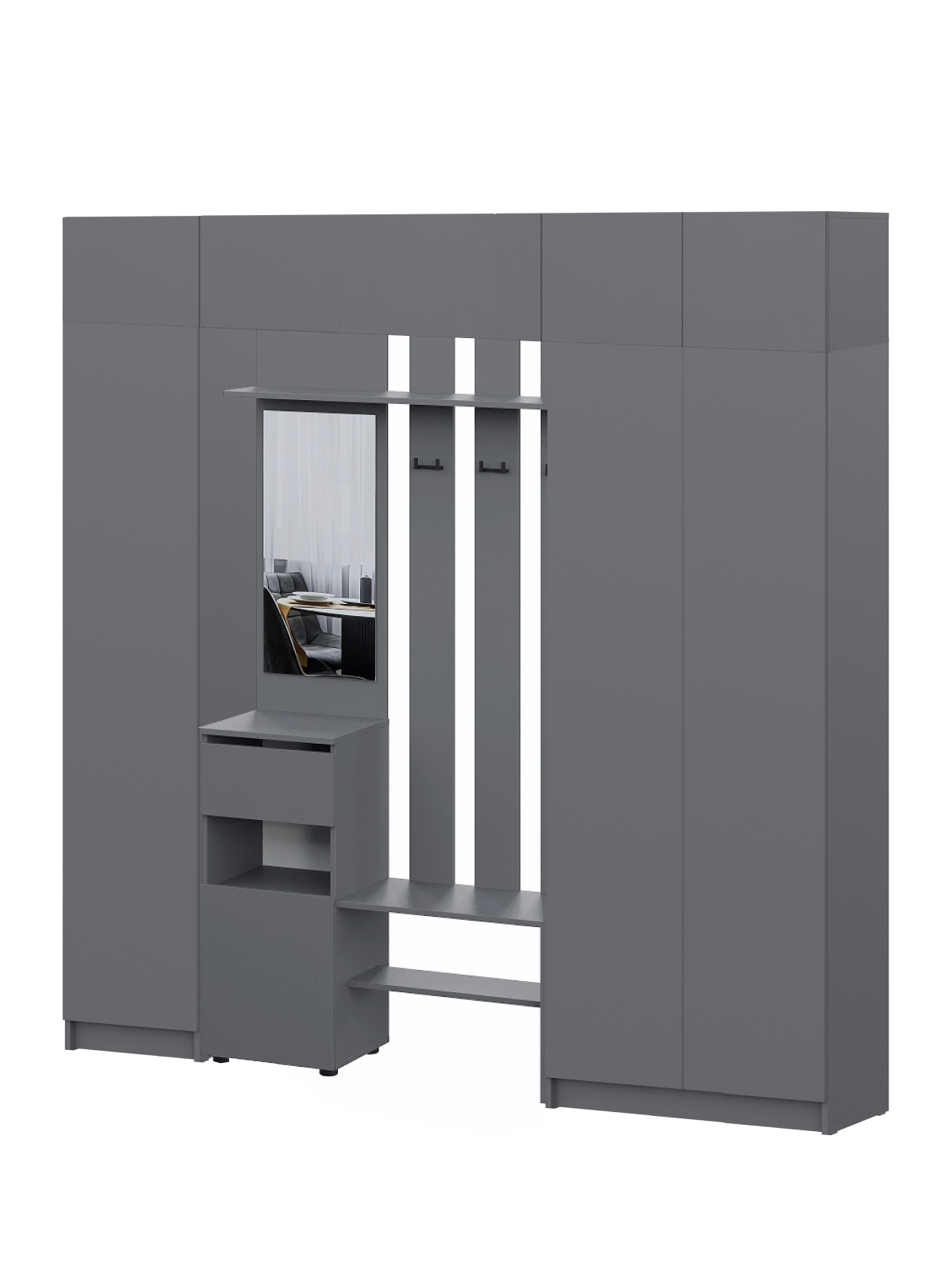 Просторная прихожая Бали создаст приятное первое впечатление при входе в квартиру. Здесь достаточно места для хранения верхней одежды, обуви и аксессуаров — предусмотрены шкафы и удобные полки. Прихожая в цвете «графит» подойдёт под любой стиль интерьера, а качественные материалы обеспечивают долговечность и лёгкость в уходе. Это пространство идеально подойдёт для тех, кто ценит чистоту, порядок и функциональность с первых шагов в доме.