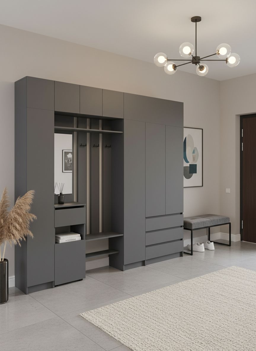 Просторная и светлая прихожая Бали создаст приятное первое впечатление при входе в квартиру. Здесь достаточно места для хранения верхней одежды, обуви и аксессуаров — предусмотрены шкафы и удобные полки. Прихожая в цвете «графит» подойдёт под любой стиль интерьера, а качественные материалы обеспечивают долговечность и лёгкость в уходе. Это пространство идеально подойдёт для тех, кто ценит чистоту, порядок и функциональность с первых шагов в доме.