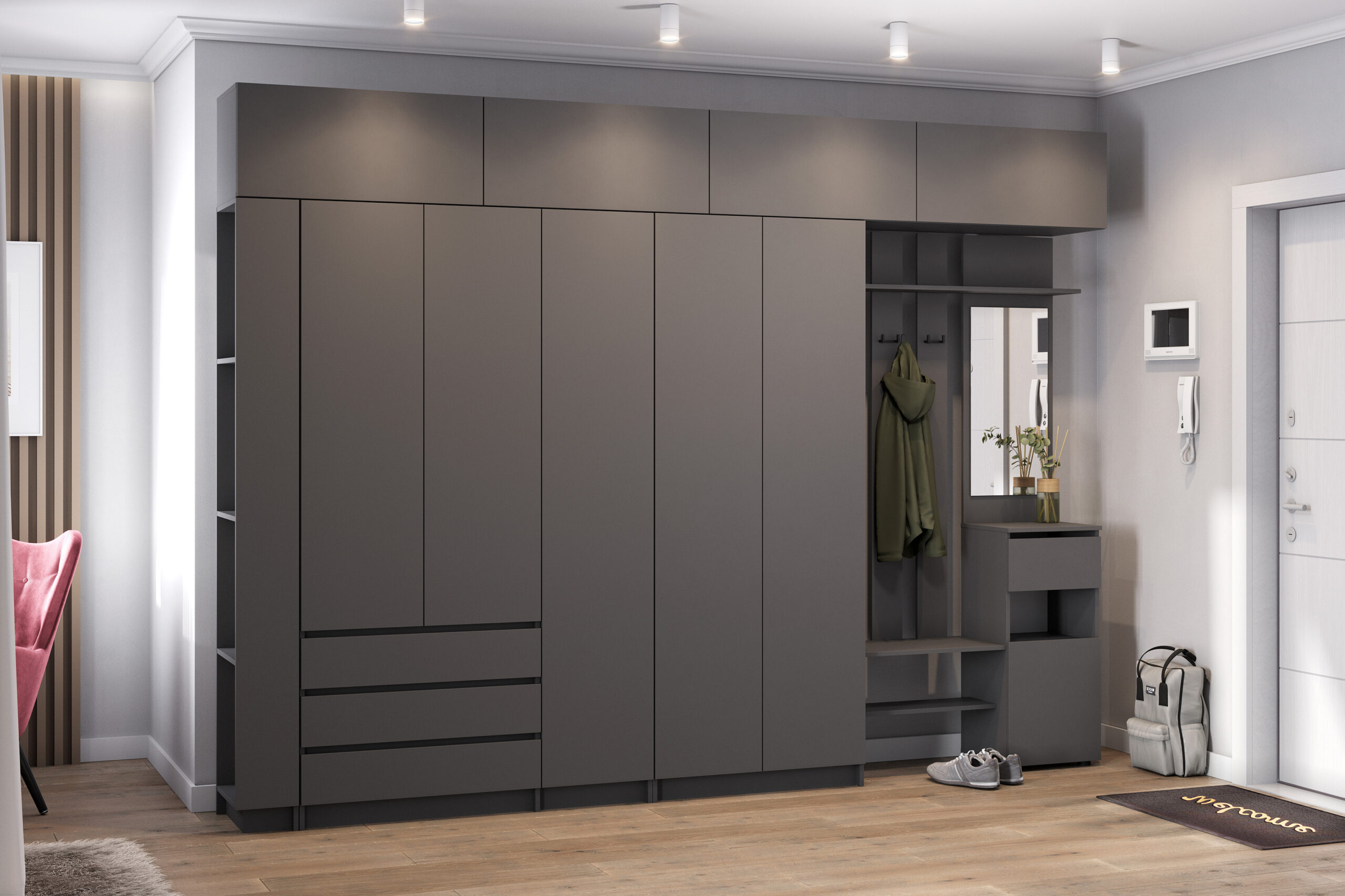 Просторная и светлая прихожая Бали создаст приятное первое впечатление при входе в квартиру. Здесь достаточно места для хранения верхней одежды, обуви и аксессуаров — предусмотрены шкафы и удобные полки. Прихожая в цвете «графит» подойдёт под любой стиль интерьера, а качественные материалы обеспечивают долговечность и лёгкость в уходе. Это пространство идеально подойдёт для тех, кто ценит чистоту, порядок и функциональность с первых шагов в доме.
