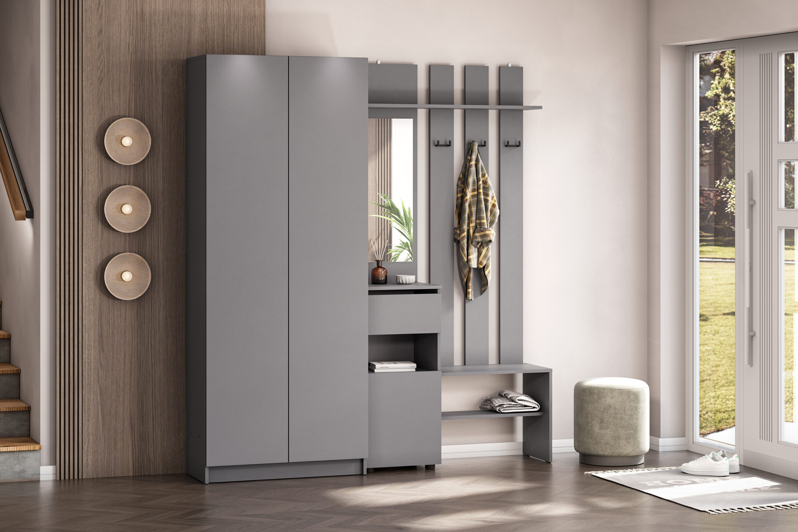 Просторная и светлая прихожая Бали создаст приятное первое впечатление при входе в квартиру. Здесь достаточно места для хранения верхней одежды, обуви и аксессуаров — предусмотрены шкафы и удобные полки. Прихожая в цвете «графит» подойдёт под любой стиль интерьера, а качественные материалы обеспечивают долговечность и лёгкость в уходе. Это пространство идеально подойдёт для тех, кто ценит чистоту, порядок и функциональность с первых шагов в доме.
