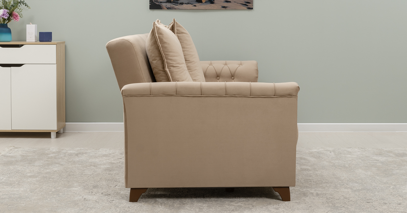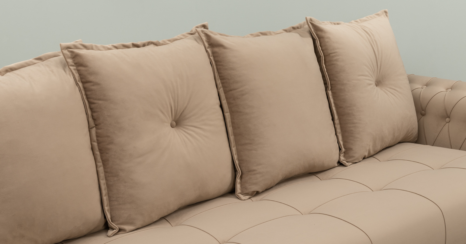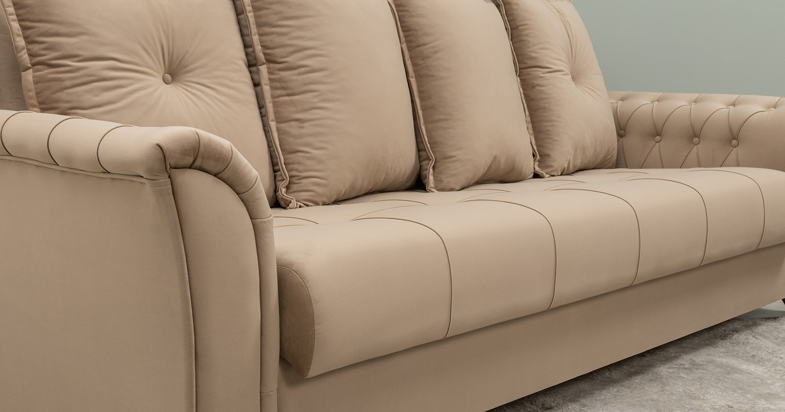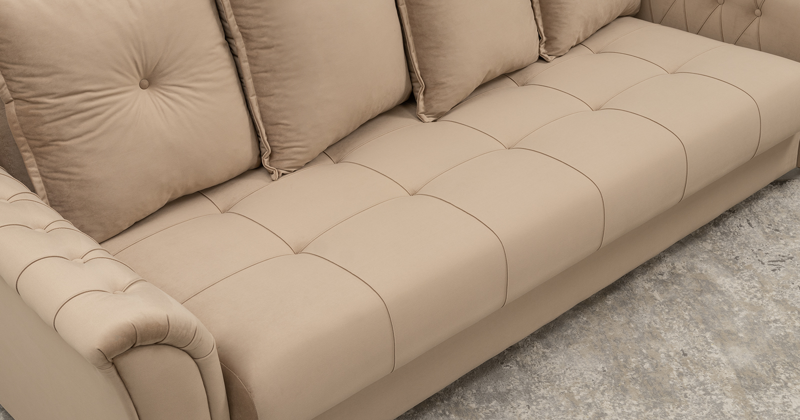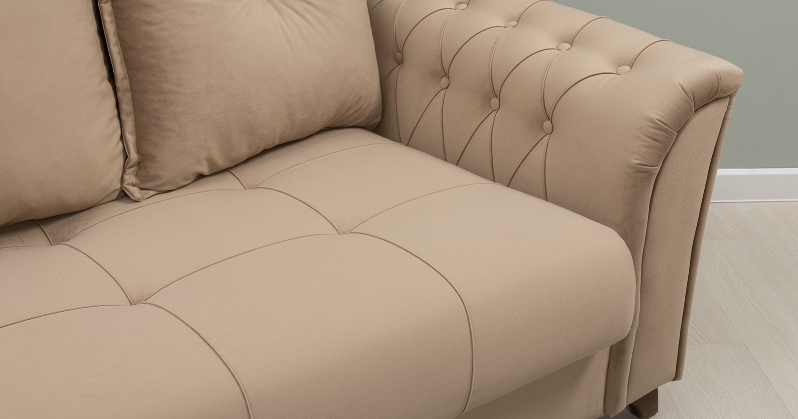 Обивка дивана-кровати выполнена из велюра Tenerife, состоящего из 100 % полиэстера. Велюр обладает объёмным густым ворсом, тактильной мягкостью и устойчивостью к зацепкам. Благодаря технологии бондинга Circle knitting волокна защищены от деформации, а устойчивость цвета к ультрафиолетовым лучам, сухому и мокрому трению гарантирует сохранение первоначального вида изделия на протяжении всего срока эксплуатации.