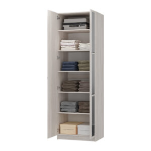 Модульная гостиная Зарина выполнена в классическом стиле и представлена двумя предметами мебели — центральной секцией с нишей под ТВ ЦС-01 и шкафом для одежды ШК-01. Центральная секция имеет набор полок с затонированными стеклянными фасадами, две закрытые створкой ниши, два выдвижных ящика и обилие открытых полок разной ширины. Шкаф оснащен стационарной штангой и полкой.