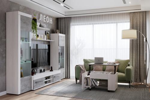 Удачно подобранные ручки оттеняют красоту бетона. Они изготовлены из массива дерева и окрашены в серебристый цвет. Фасады витрин мебельной коллекции ЛЕОН выполнены из тонированного серого стекла. Сдержанный и благородный оттенок соответствует всем свежим тенденциям интерьерного дизайна. Поэтому к гостиной ЛЕОН так легко подобрать современные светильники и аксессуары для дома.