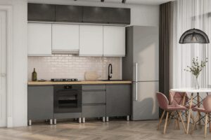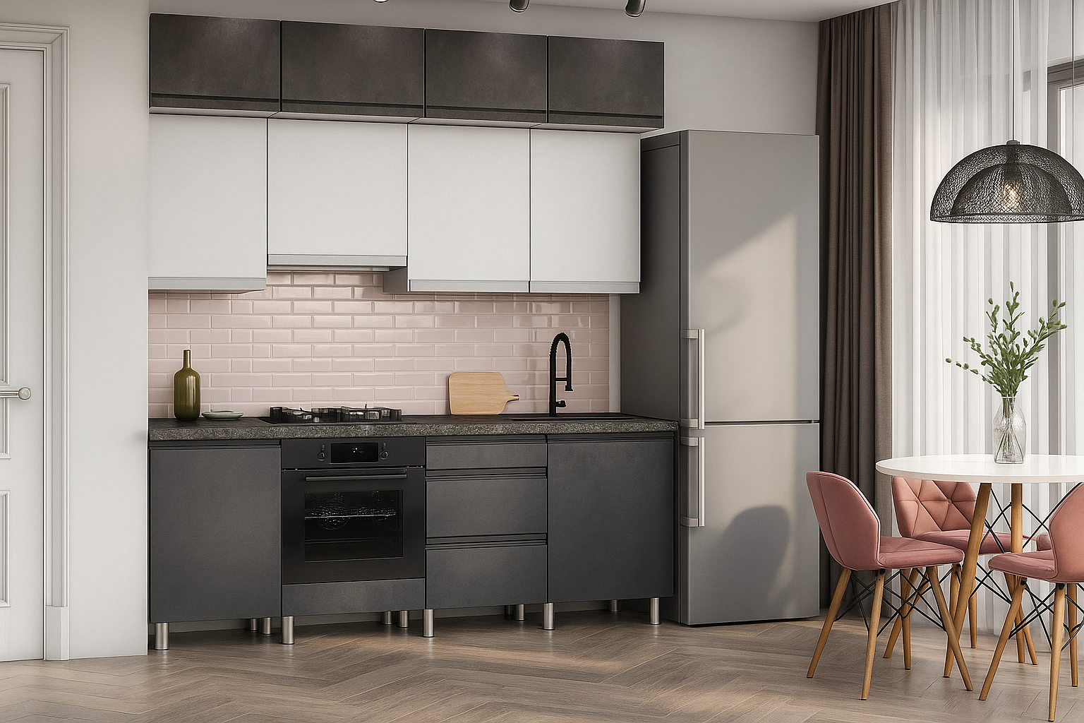 Готовая кухня Вектор — компактное и функциональное решение для вашего дома. Кухонный гарнитур сочетает в себе современный минимализм, эргономичность и надежность.