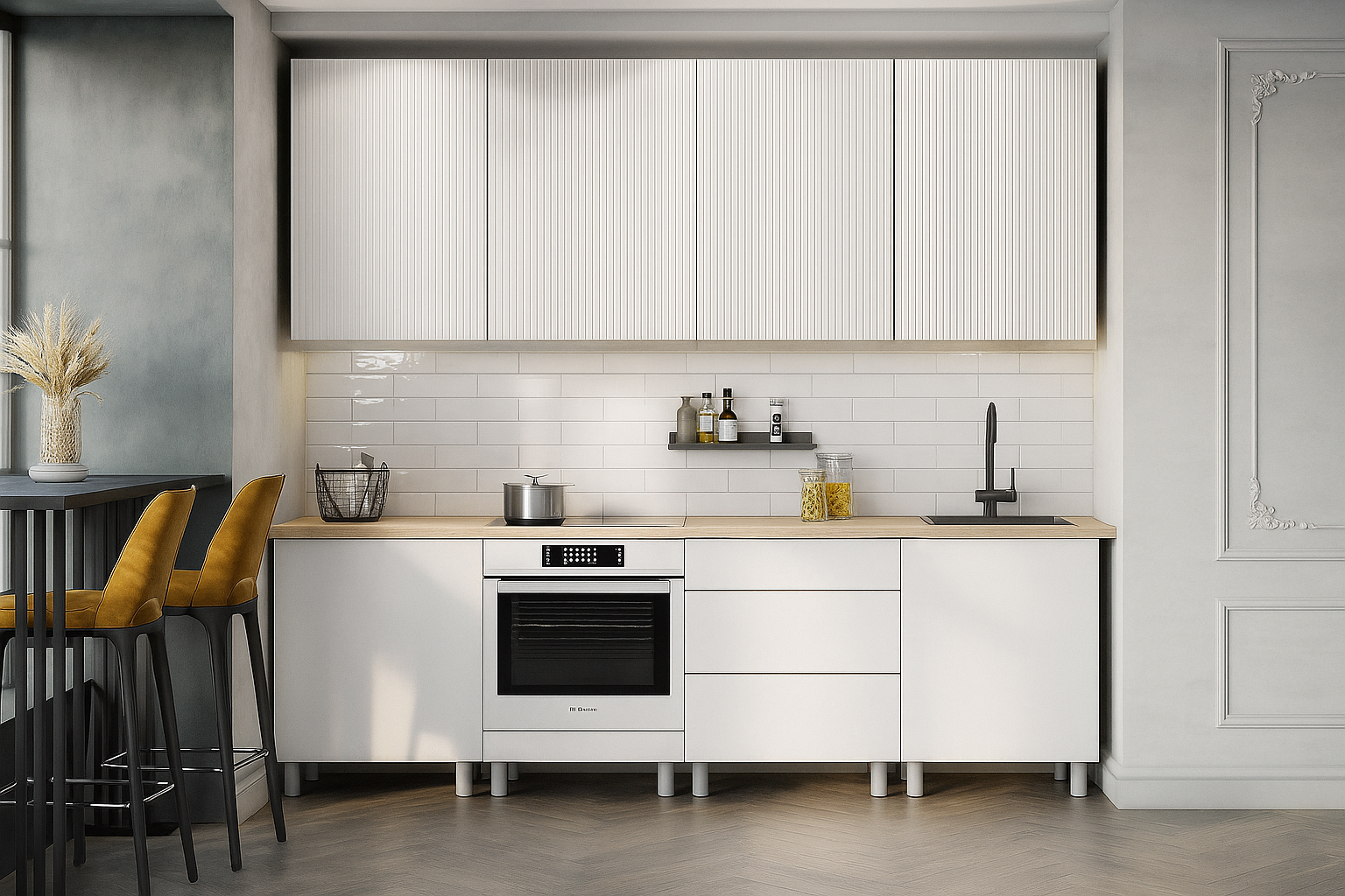 Готовая кухня Вектор — компактное и функциональное решение для вашего дома. Кухонный гарнитур сочетает в себе современный минимализм, эргономичность и надежность.