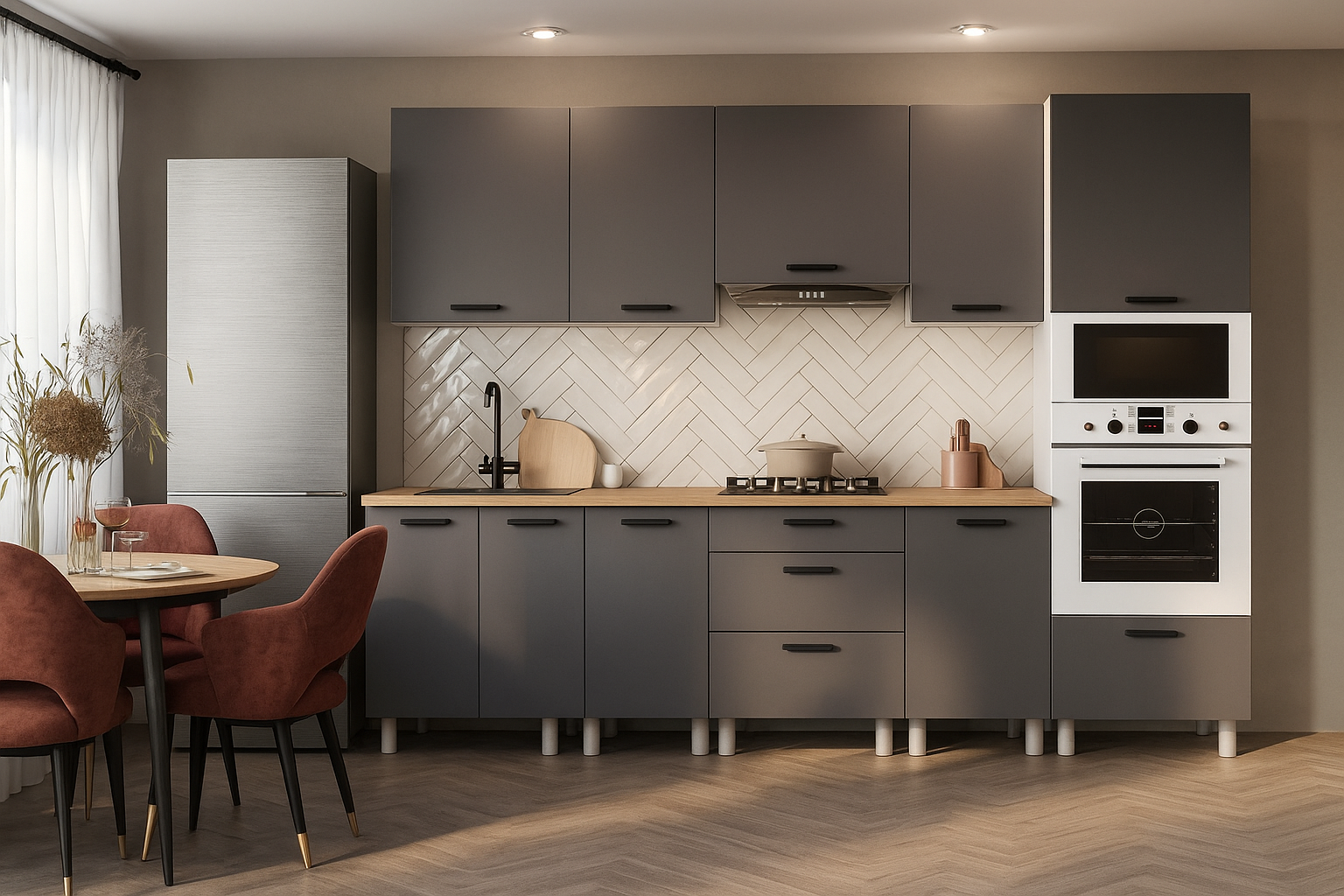Готовая кухня Вектор — компактное и функциональное решение для вашего дома. Кухонный гарнитур сочетает в себе современный минимализм, эргономичность и надежность.