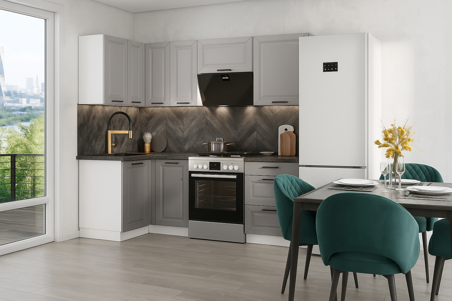 Готовая кухня Вектор — компактное и функциональное решение для вашего дома. Кухонный гарнитур сочетает в себе современный минимализм, эргономичность и надежность.