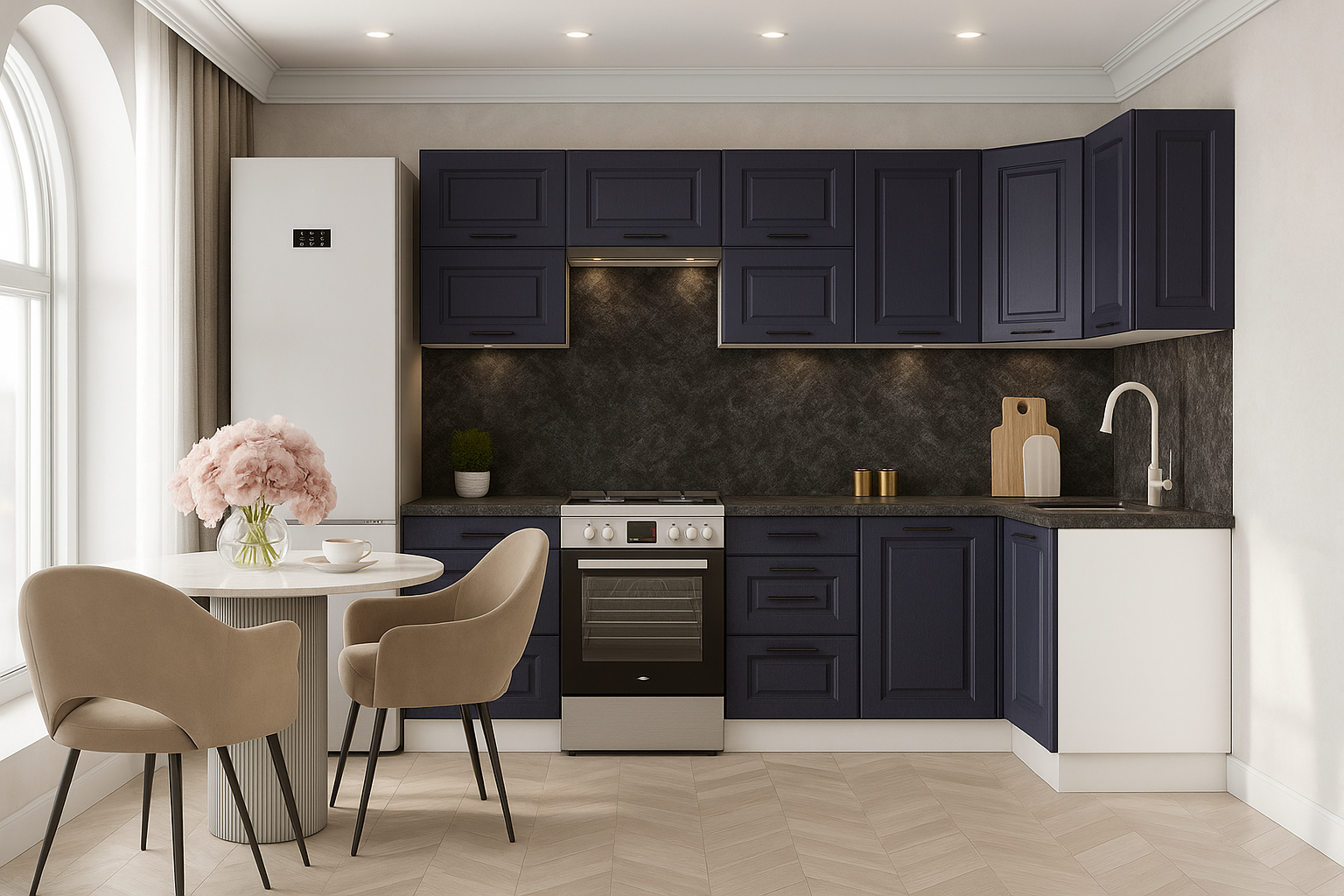 Готовая кухня Вектор — компактное и функциональное решение для вашего дома. Кухонный гарнитур сочетает в себе современный минимализм, эргономичность и надежность.