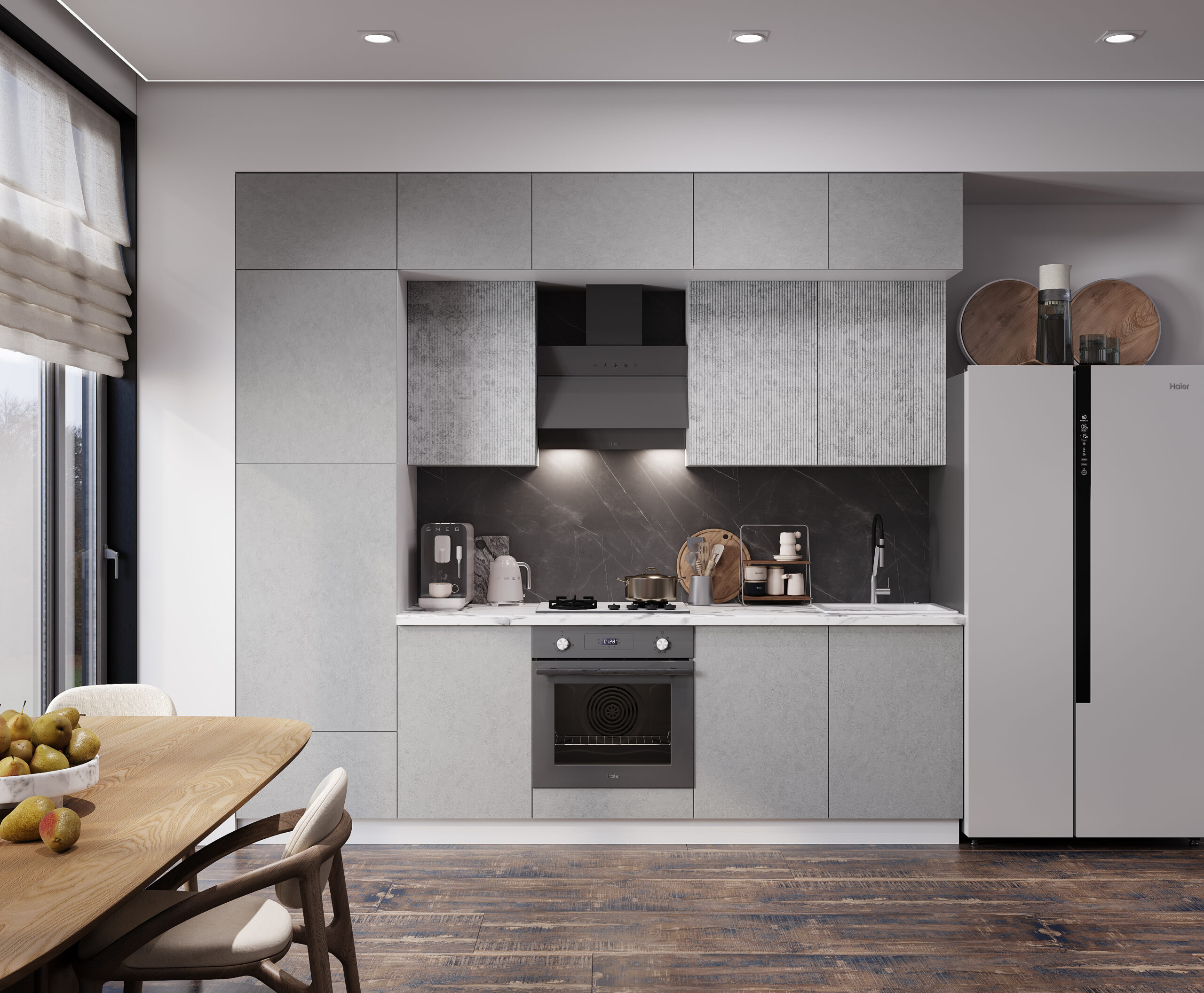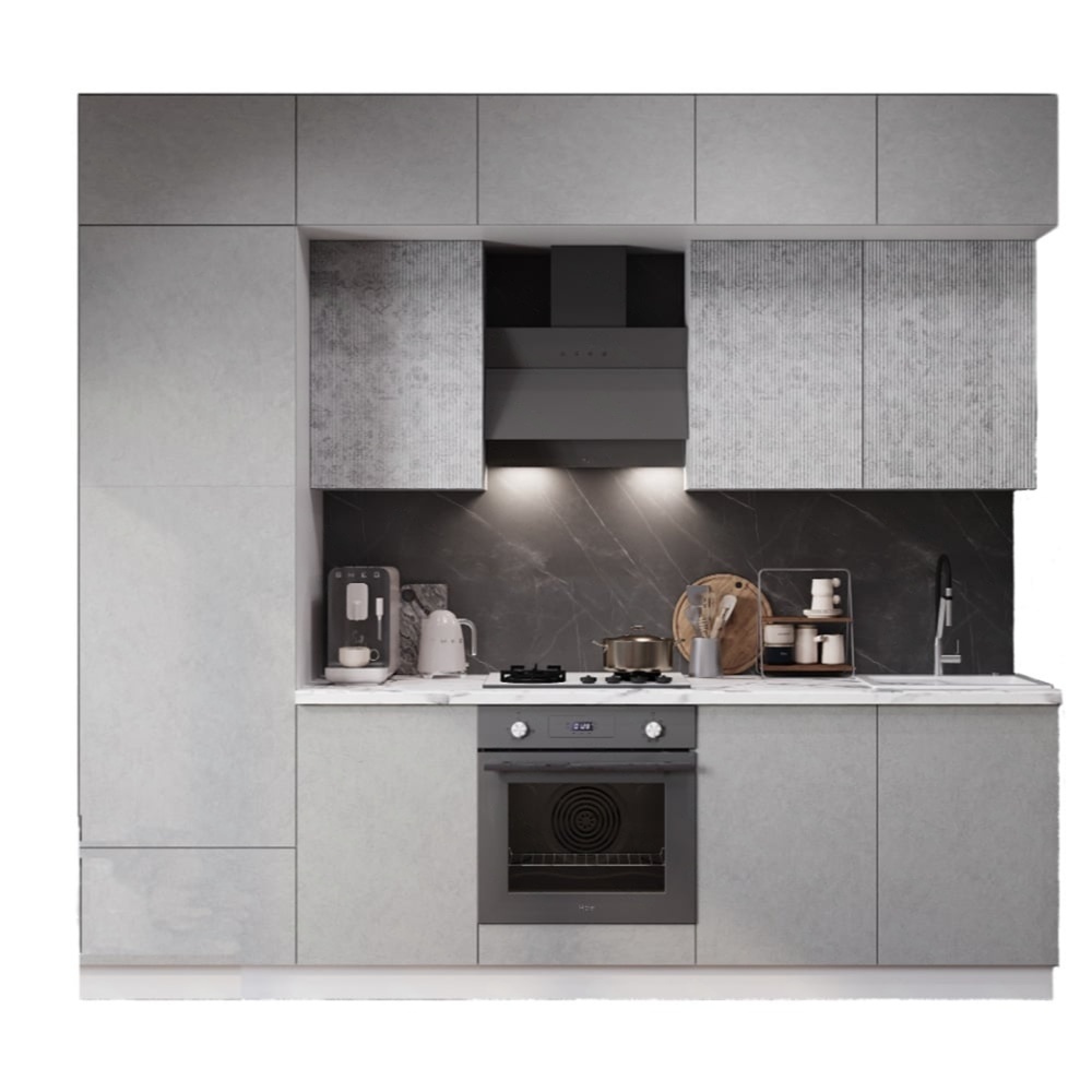 Фактурная кухня с благородной текстурой декоративной штукатурки. В комплекте: массивная столешница 38 мм в цвете «белый мрамор», система push to open для открытия легким нажатием, шариковые направляющие – тихий бонус к безупречной функциональности. Газлифт обеспечивает плавное открытие дверок, петли с доводчиками. Дополнительно можно приобрести цоколь для нижних модулей.