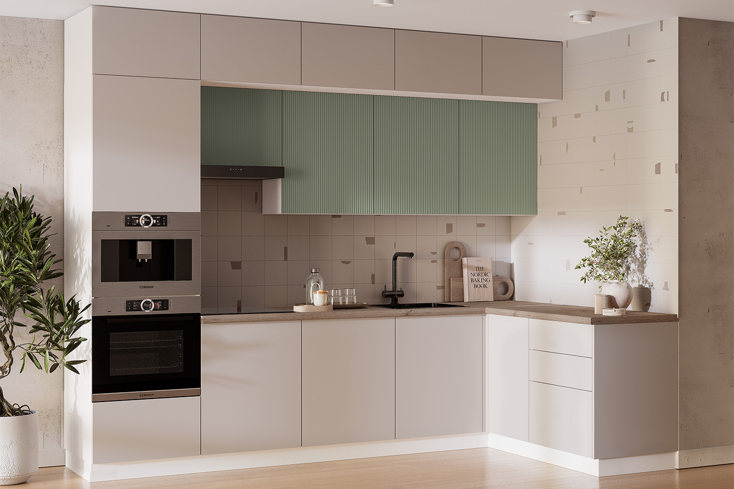 Угловая кухня в теплой природной палитре. В комплекте: массивная столешница 38 мм в цвете «дуб кера», система push to open для открытия легким нажатием, шариковые направляющие – тихий бонус к безупречной функциональности. Газлифт обеспечивает плавное открытие дверок, петли с доводчиками. Дополнительно можно приобрести цоколь для нижних модулей.