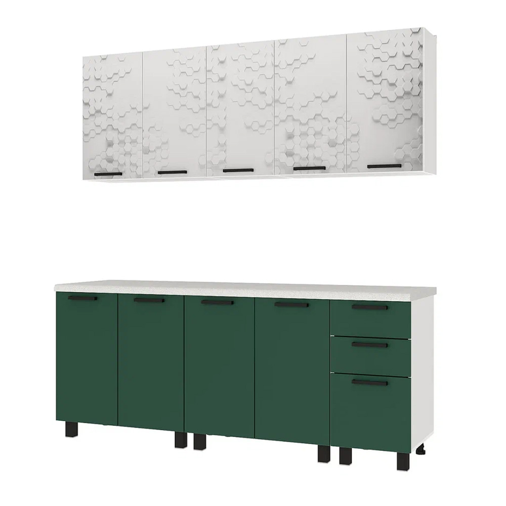 Стильная функциональная кухня, выполненная в стилях современная классика и минимализм. Верхние модули декорированы фотопечатью с 3D рисунком. Фасады нижних модулей выполнены в двух трендовых цветовых решениях — насыщенном зеленом цвете с текстурой soft-touch и абсолютно матовой поверхностью цвета тауп.