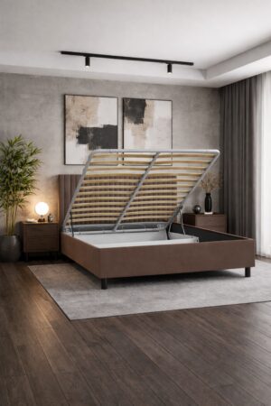 Высокое мягкое изголовье обеспечивает дополнительный комфорт — на него удобно опереться во время чтения, просмотра фильмов или отдыха. Кровать устанавливается на прочные металлические опоры высотой 12 см, что облегчает уборку и поддержание чистоты под мебелью.