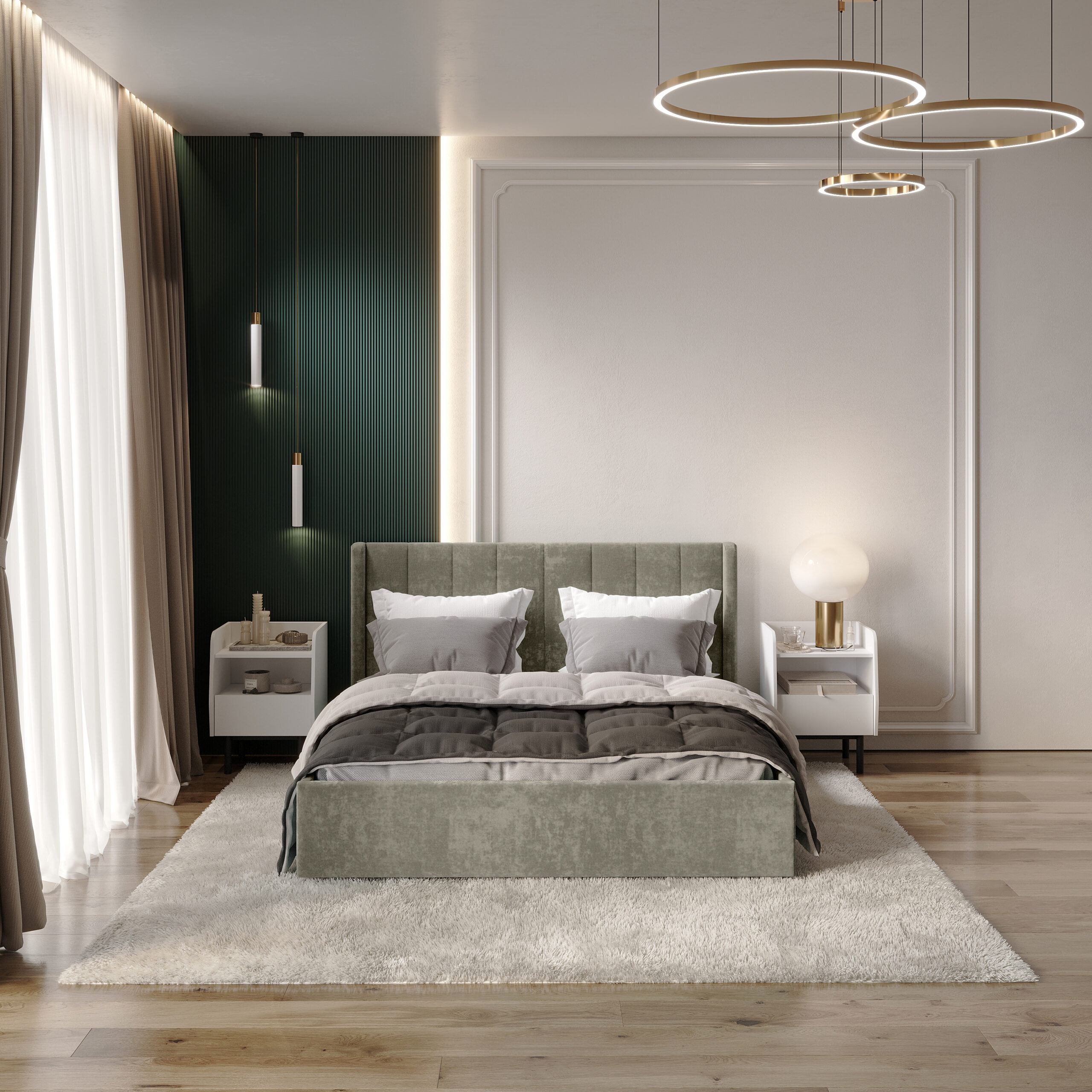 — Материал мягких частей — велюр, задняя сторона — спанбонд серый. Декор изголовья — стежка.