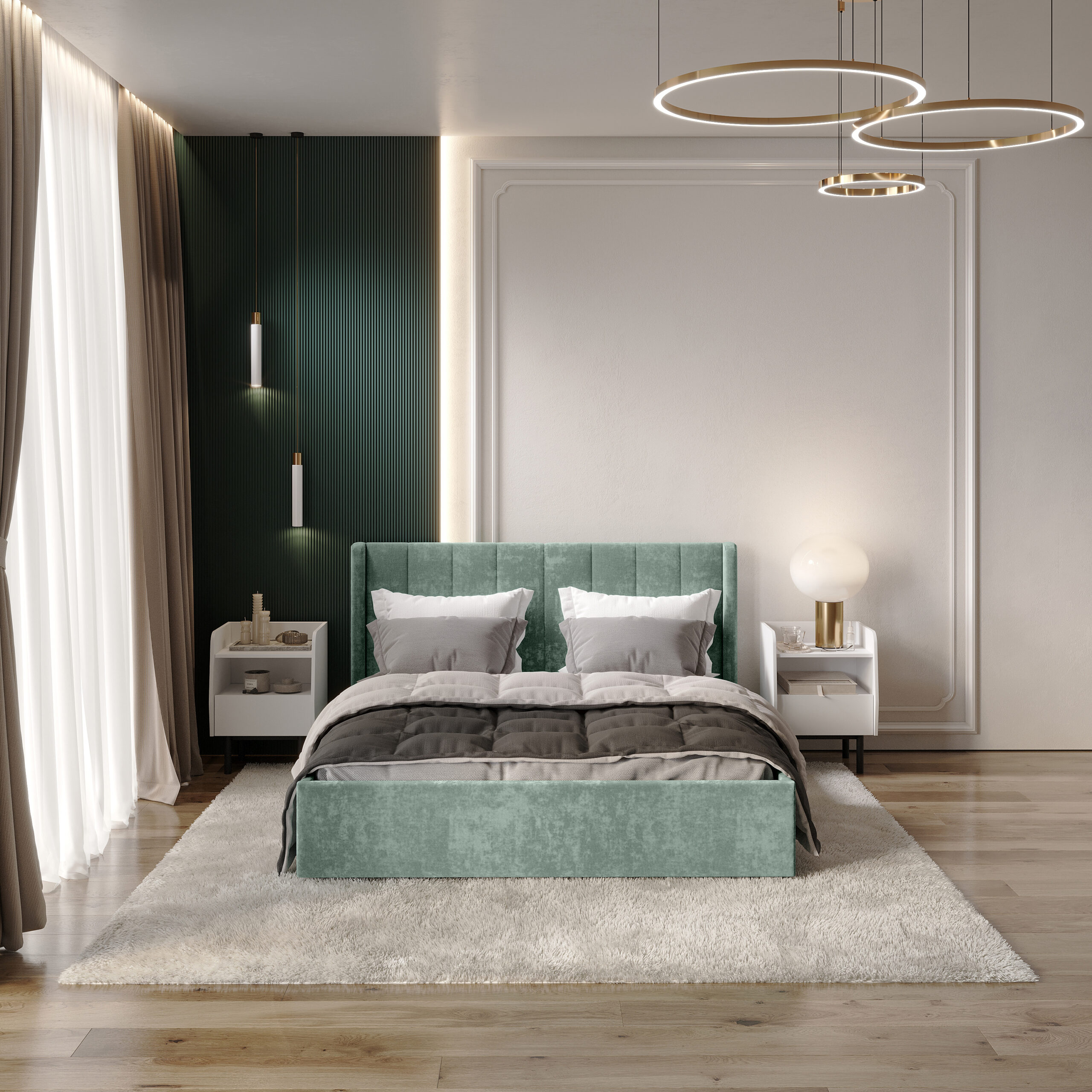 — Материал мягких частей — велюр, задняя сторона — спанбонд серый. Декор изголовья — стежка.