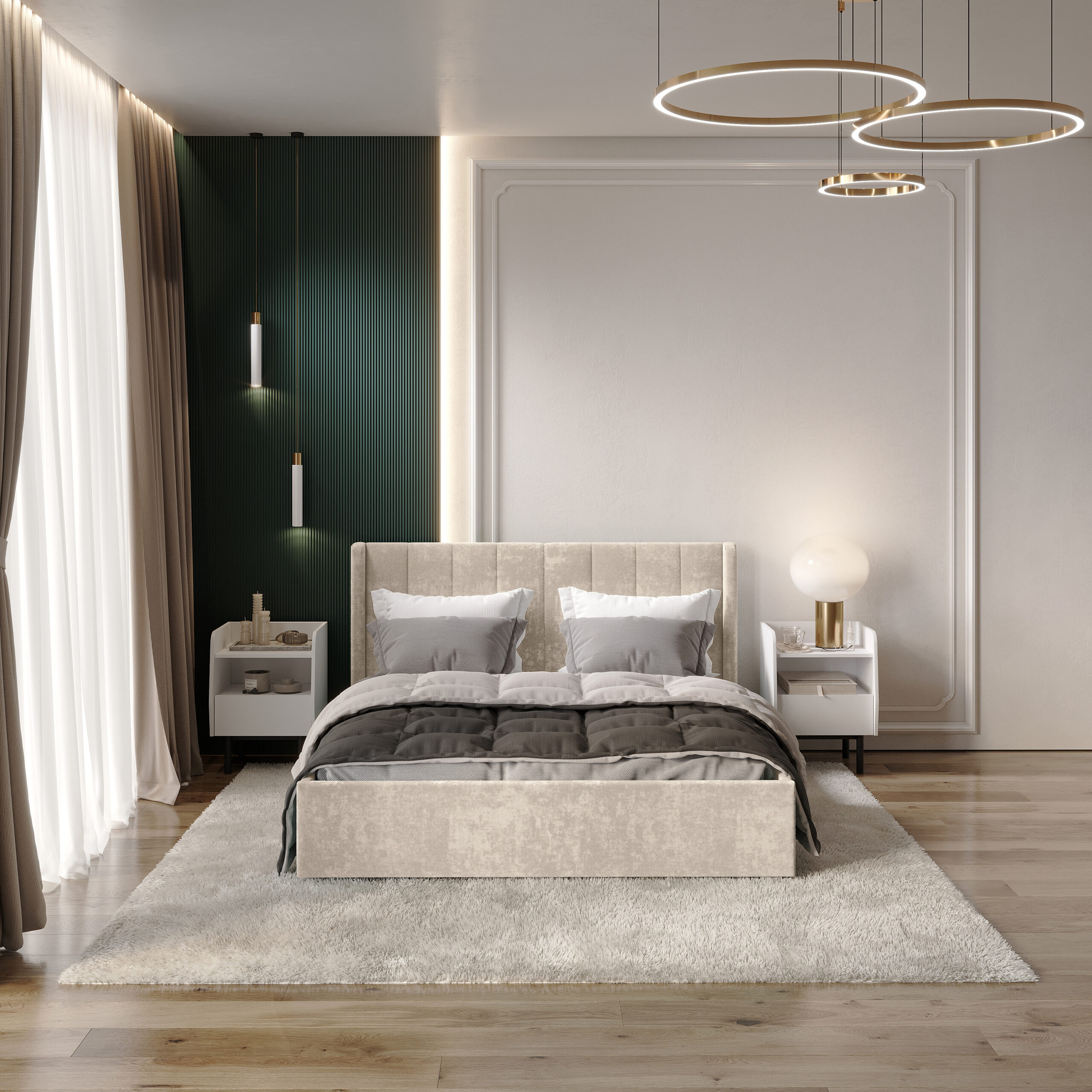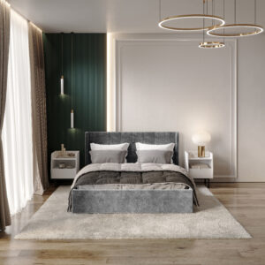— Материал мягких частей — велюр, задняя сторона — спанбонд серый. Декор изголовья — стежка.