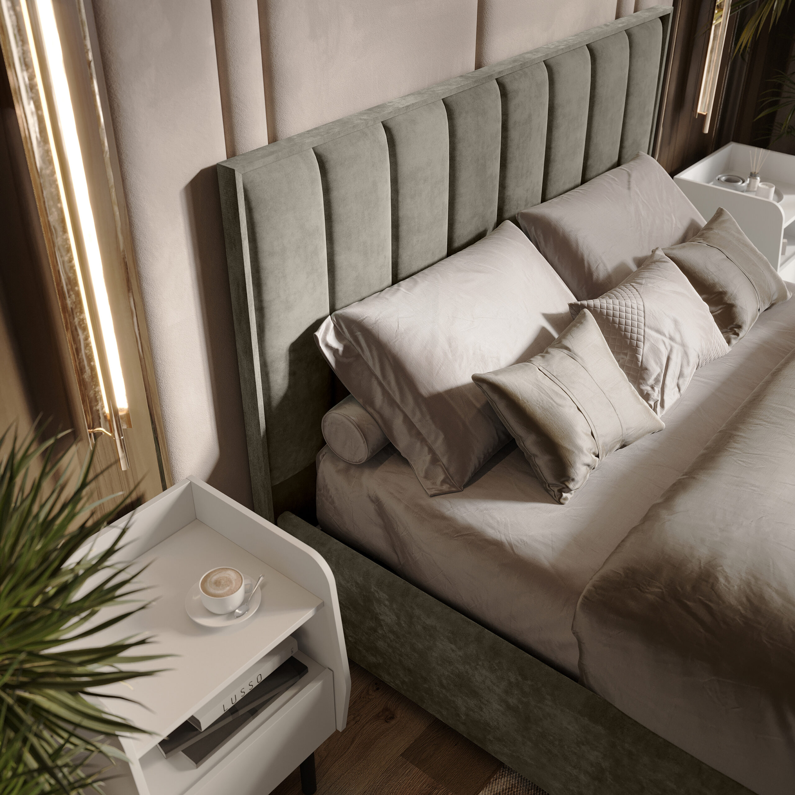 Изголовье, царги и изножье — это мягкие части кровати. Изголовье и изножье оформлены мягкими накладками, расцветка соответвует варианту исполнения. Ткань обивки — велюр.