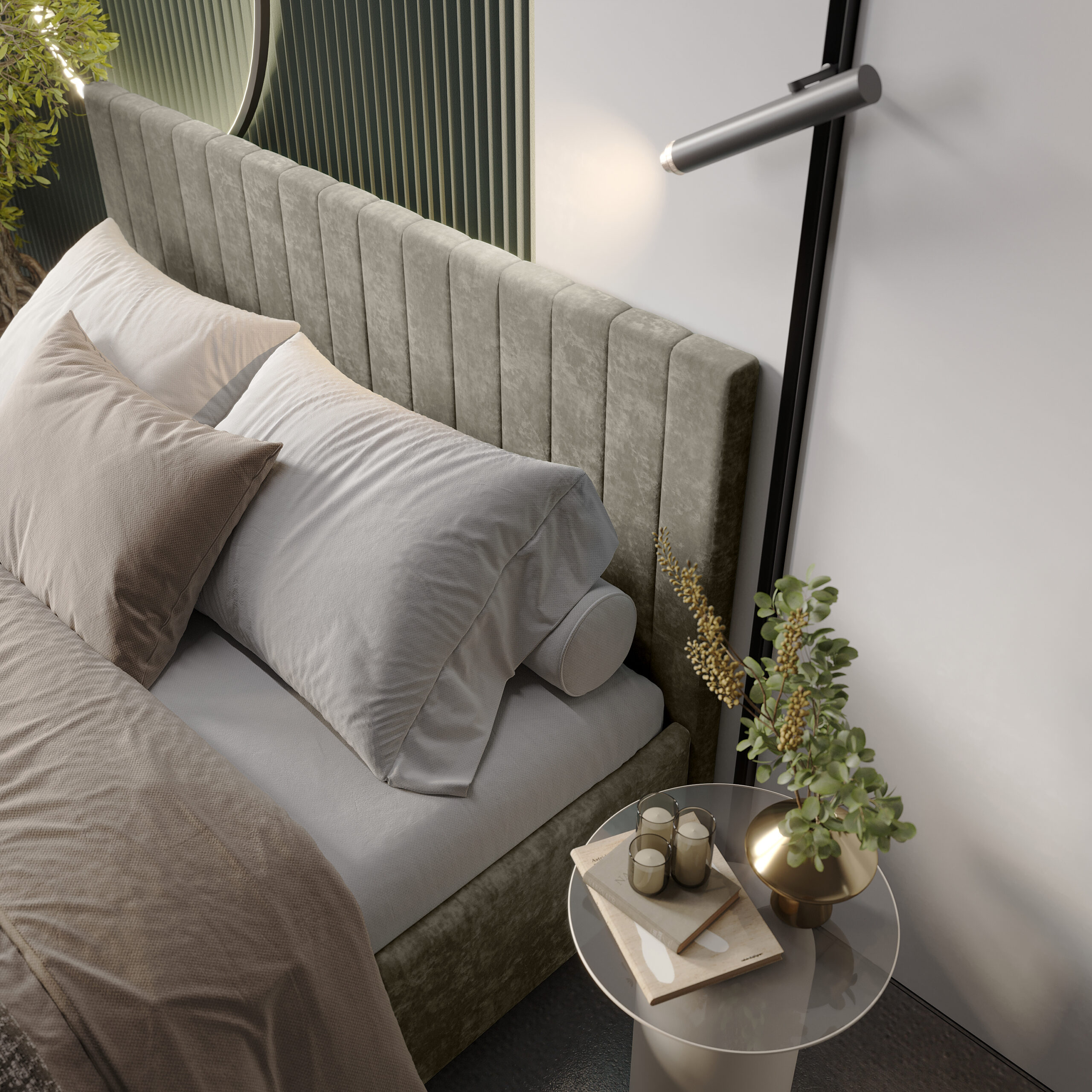 — Материал мягких частей (изголовье, царги, изножье) — велюр, поролон; задняя сторона — спанбонд серый. Поролон: мягкое изголовье — 20 мм, изножье — 30 мм, царги — 20 мм. Декор изголовья — стежка.