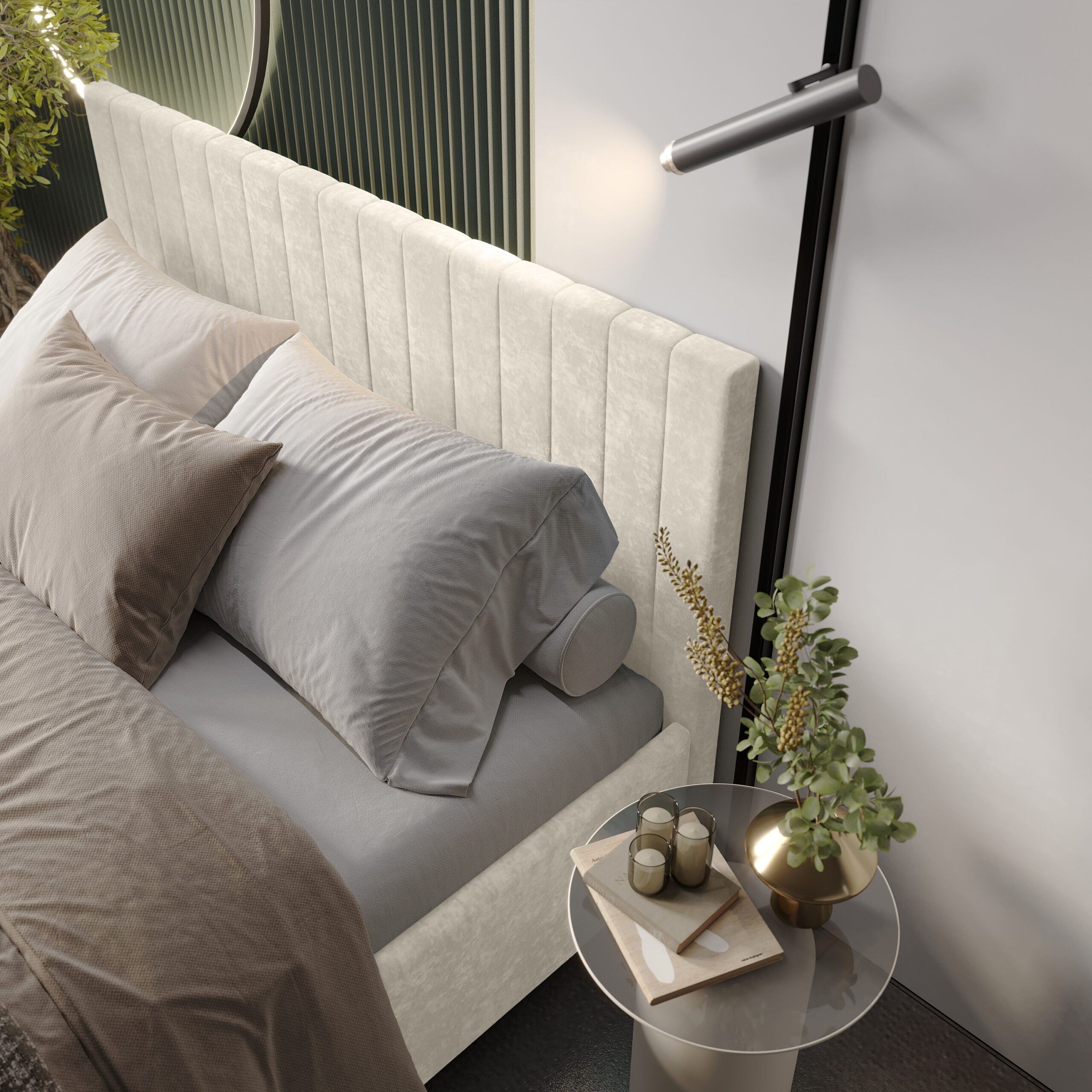 — Материал мягких частей (изголовье, царги, изножье) — велюр, поролон; задняя сторона — спанбонд серый. Поролон: мягкое изголовье — 20 мм, изножье — 30 мм, царги — 20 мм. Декор изголовья — стежка.
