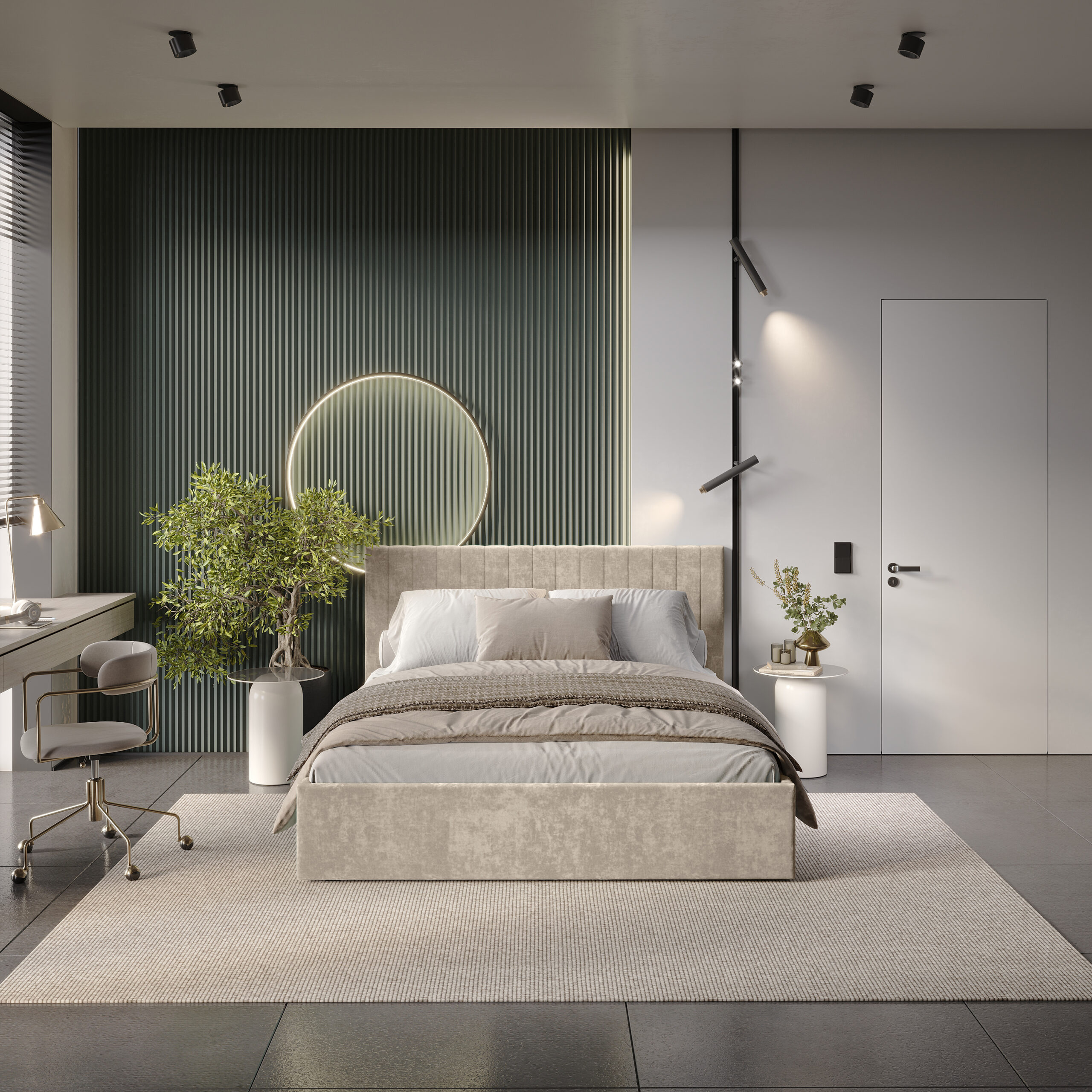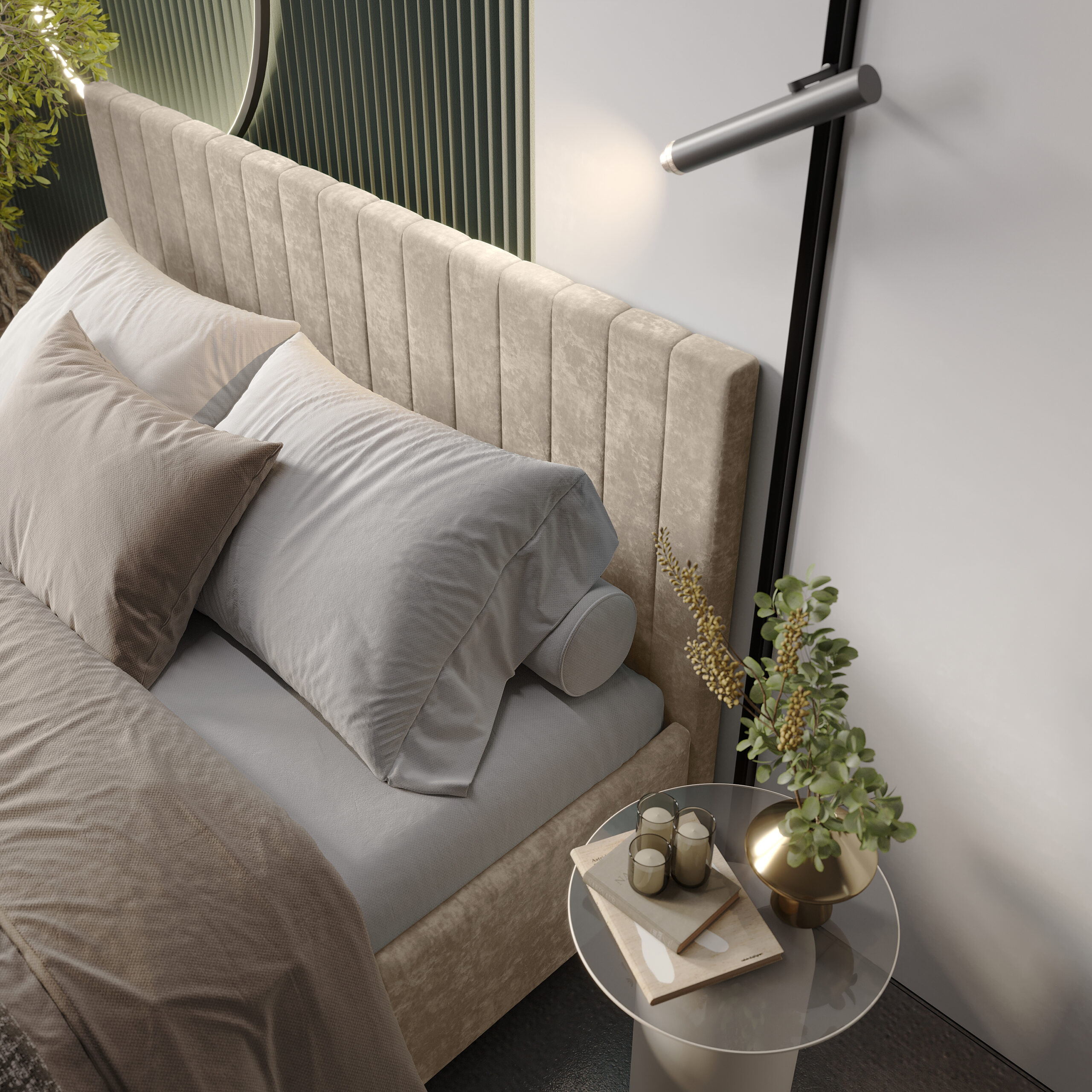 — Материал мягких частей (изголовье, царги, изножье) — велюр, поролон; задняя сторона — спанбонд серый. Поролон: мягкое изголовье — 20 мм, изножье — 30 мм, царги — 20 мм. Декор изголовья — стежка.