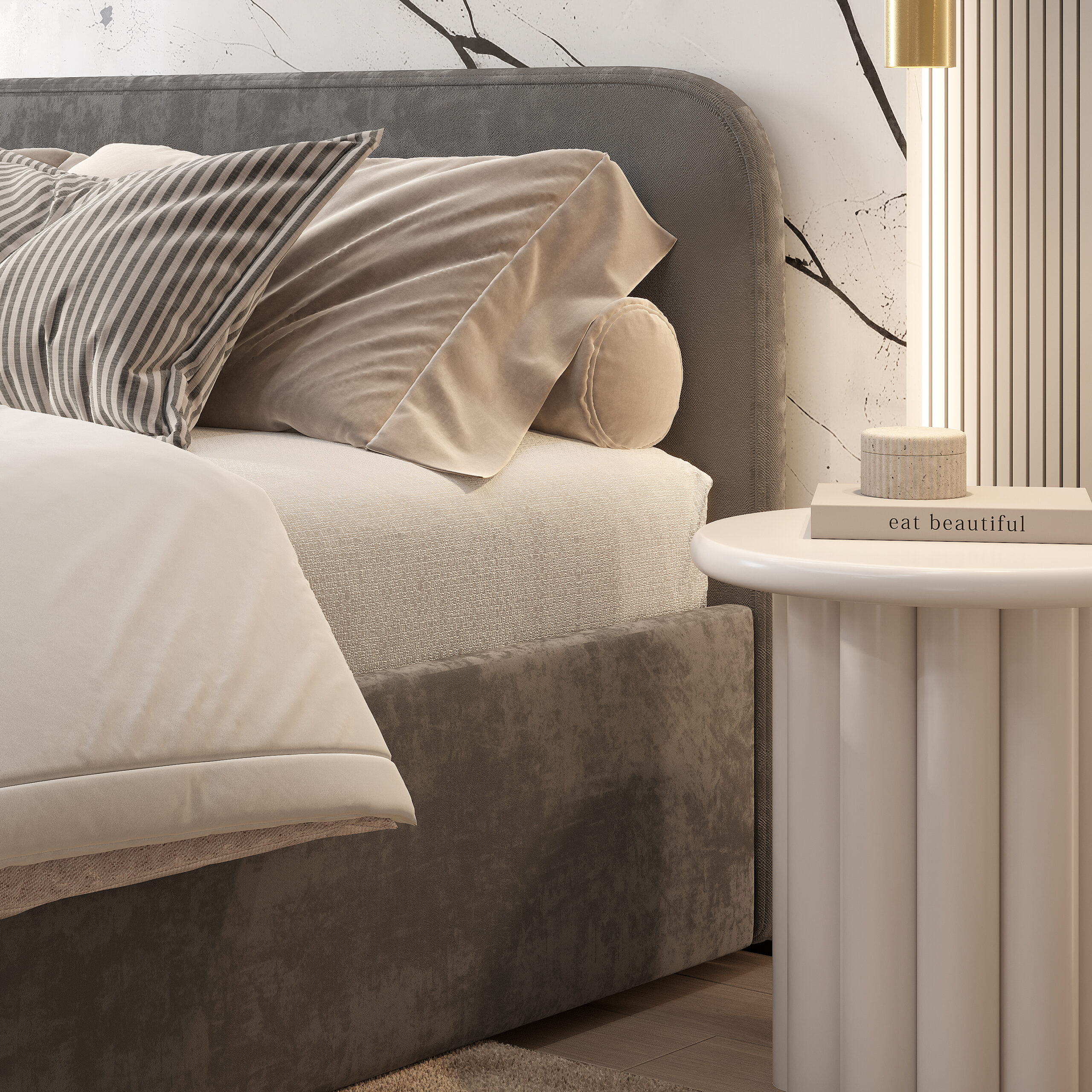 Материал мягких частей — велюр, задняя сторона – спанбонд серый. Изголовье, царги и изножье – это мягкие части кровати. Мягкое изголовье, изножье и царги (поролон 30 мм, 30 мм и 20 мм соответственно). Декор изголовья – радиусные углы.