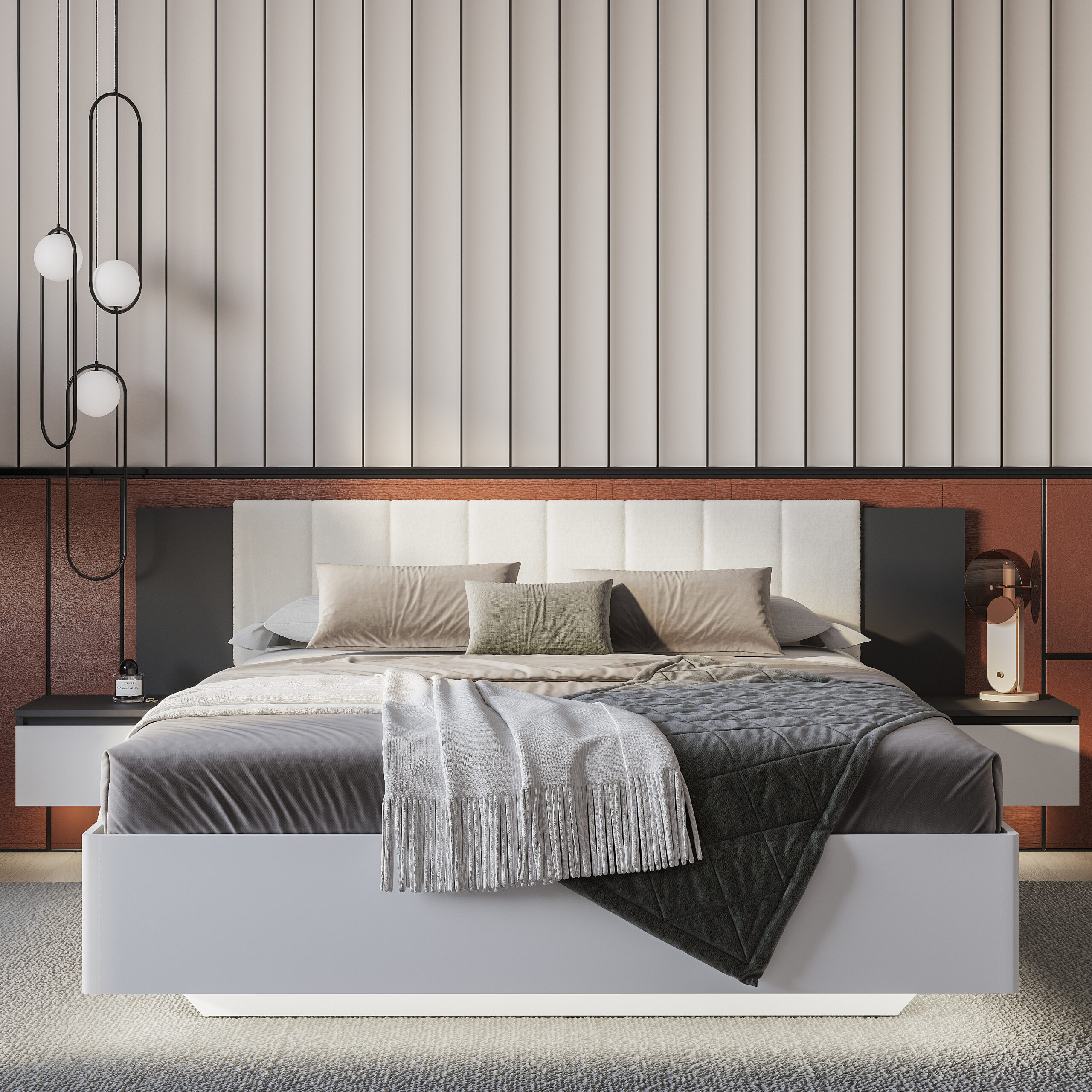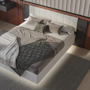Коллекция «Шарм» — современная классика в контрастном исполнении «белый/графит». Кровать с парящим эффектом в трендовой ткани «барашек» — сердце коллекции.