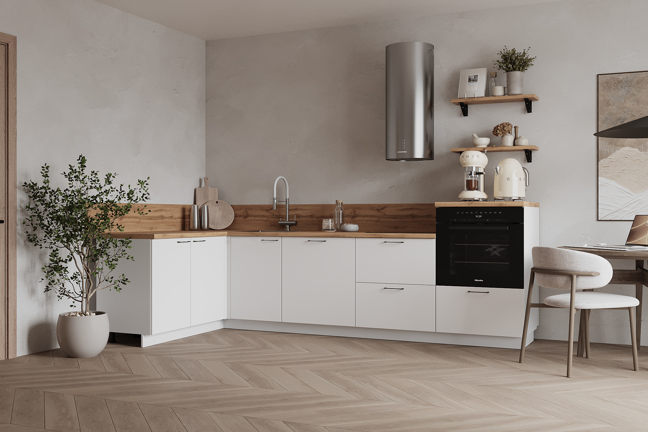 — Эстетика и зонирование: высокий модуль для духового шкафа делает интерьер аккуратным и современным.