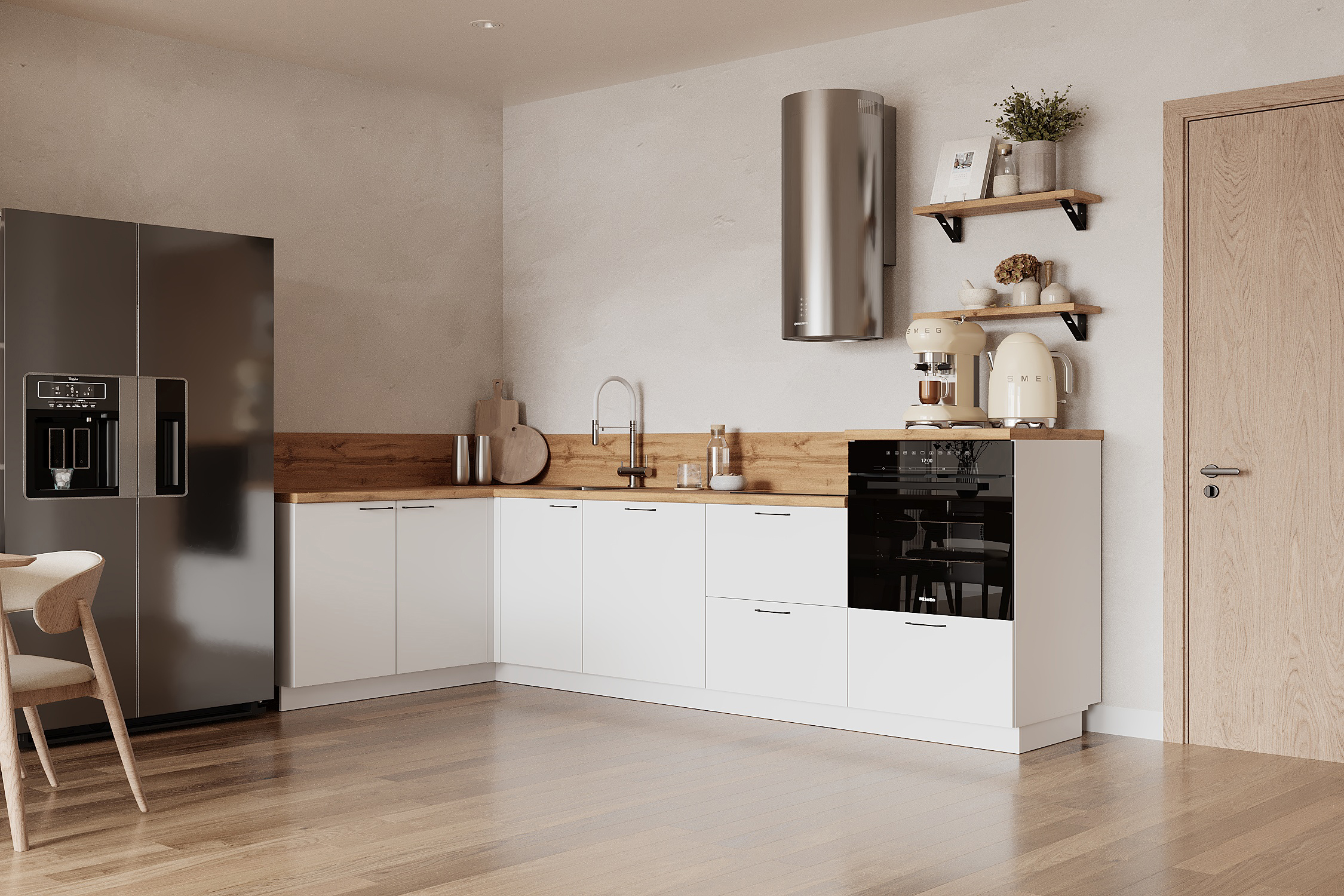 — Эстетика и зонирование: высокий модуль для духового шкафа делает интерьер аккуратным и современным.