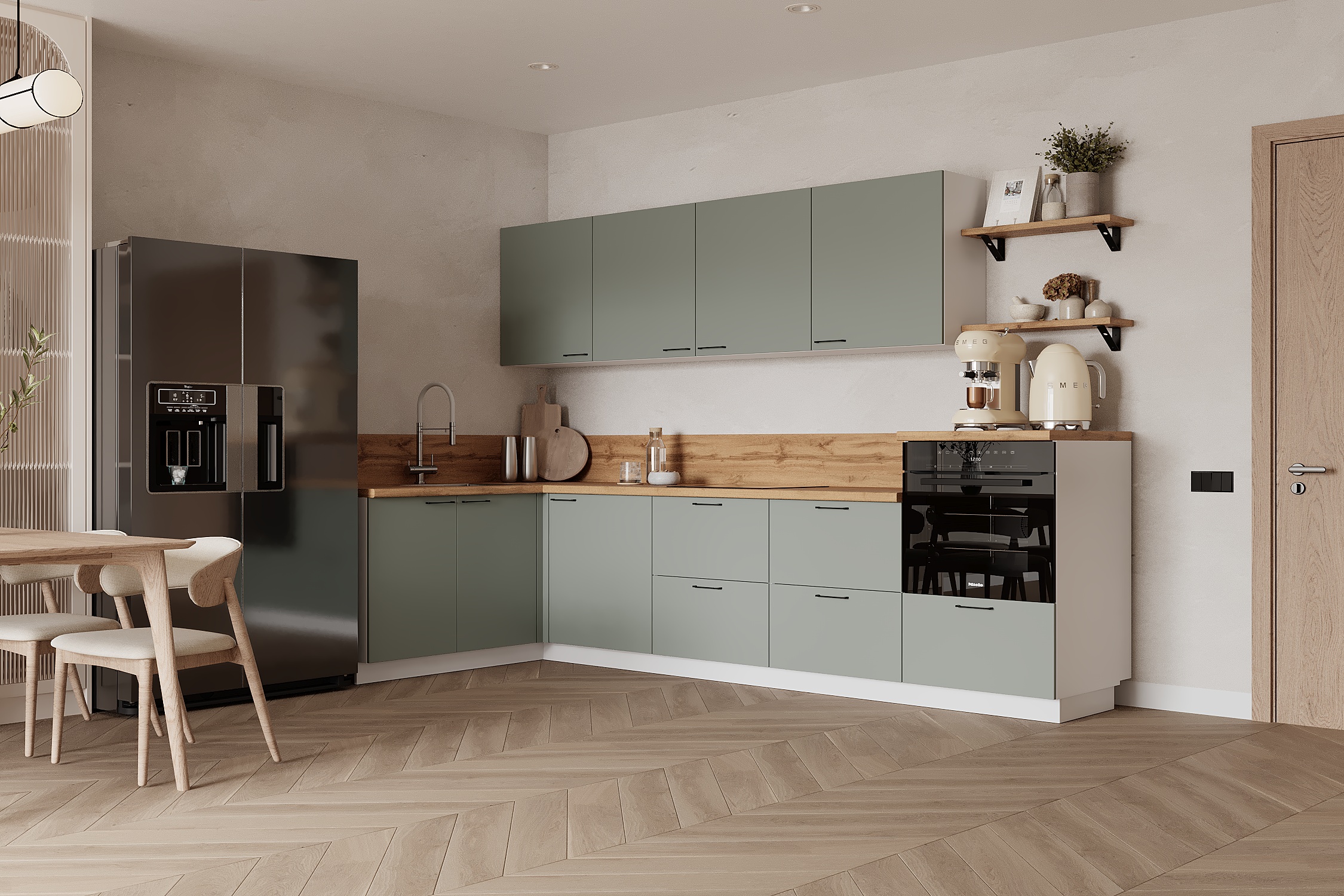 Кухня «Лизет» сочетает петербургскую элегантность и современную функциональность. Вдохновлённая эпохой Петра I и архитектурой Петербурга, она объединяет благородные цвета, тёплую древесную текстуру и лаконичные линии — для создания уютной и гармоничной кухни.