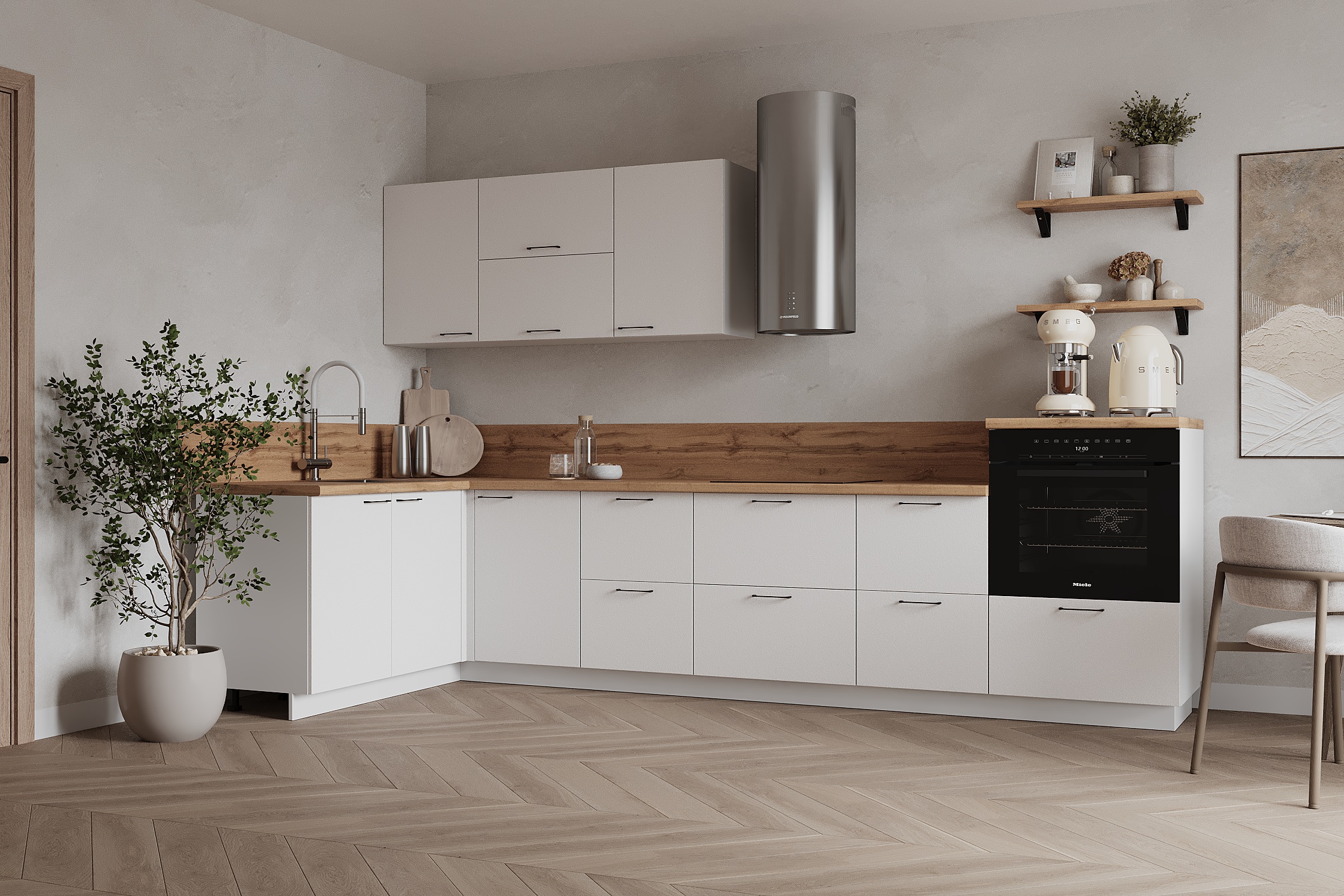 — Эстетика и зонирование: высокий модуль для духового шкафа делает интерьер аккуратным и современным.