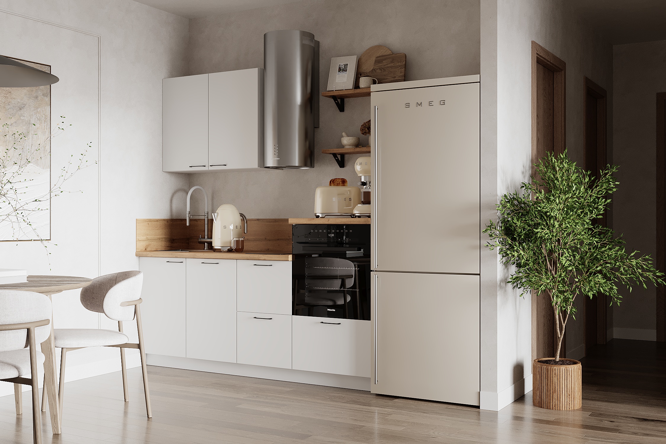 — Эстетика и зонирование: высокий модуль для духового шкафа делает интерьер аккуратным и современным.
