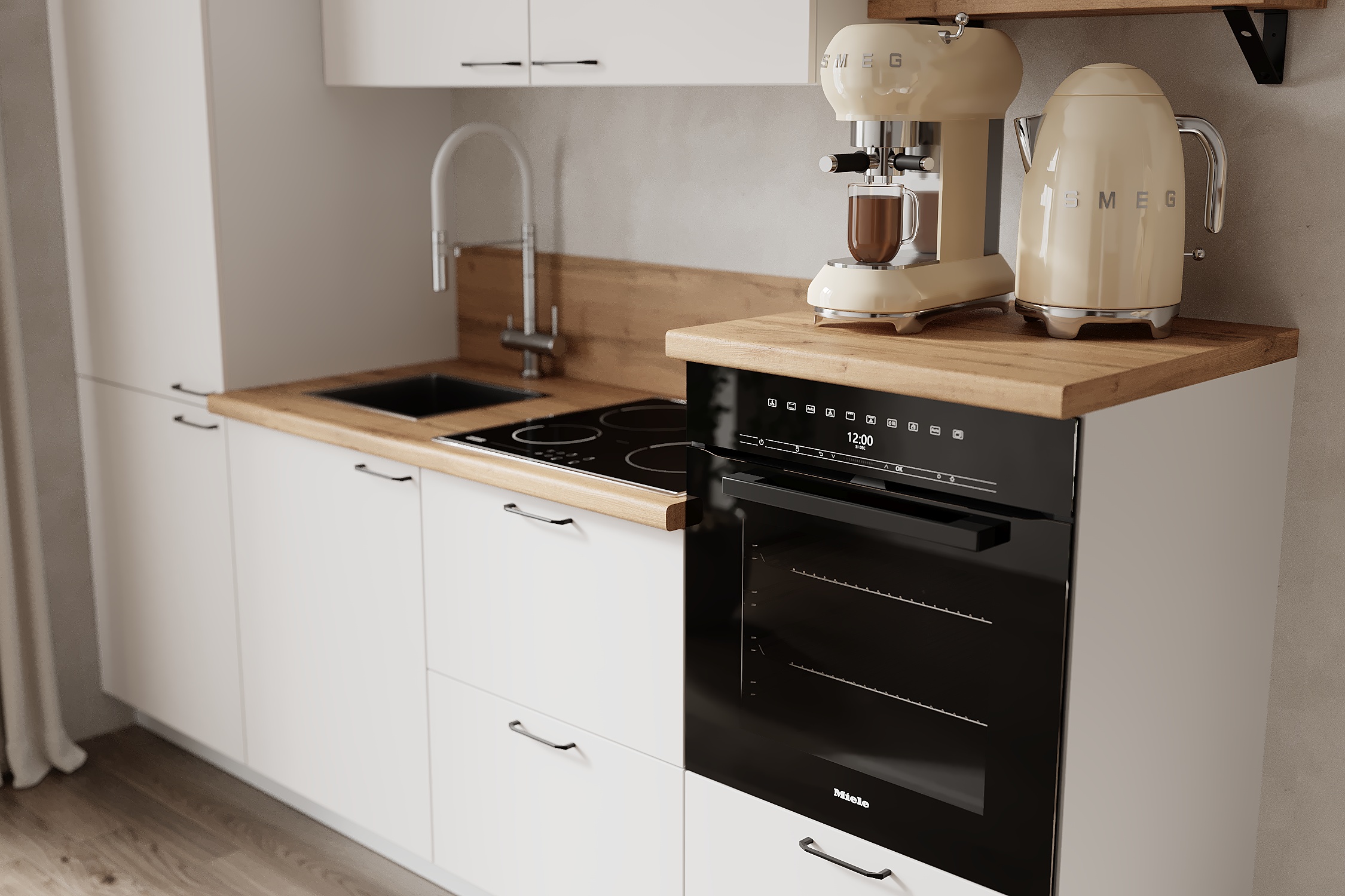 — Эстетика и зонирование: высокий модуль для духового шкафа делает интерьер аккуратным и современным.