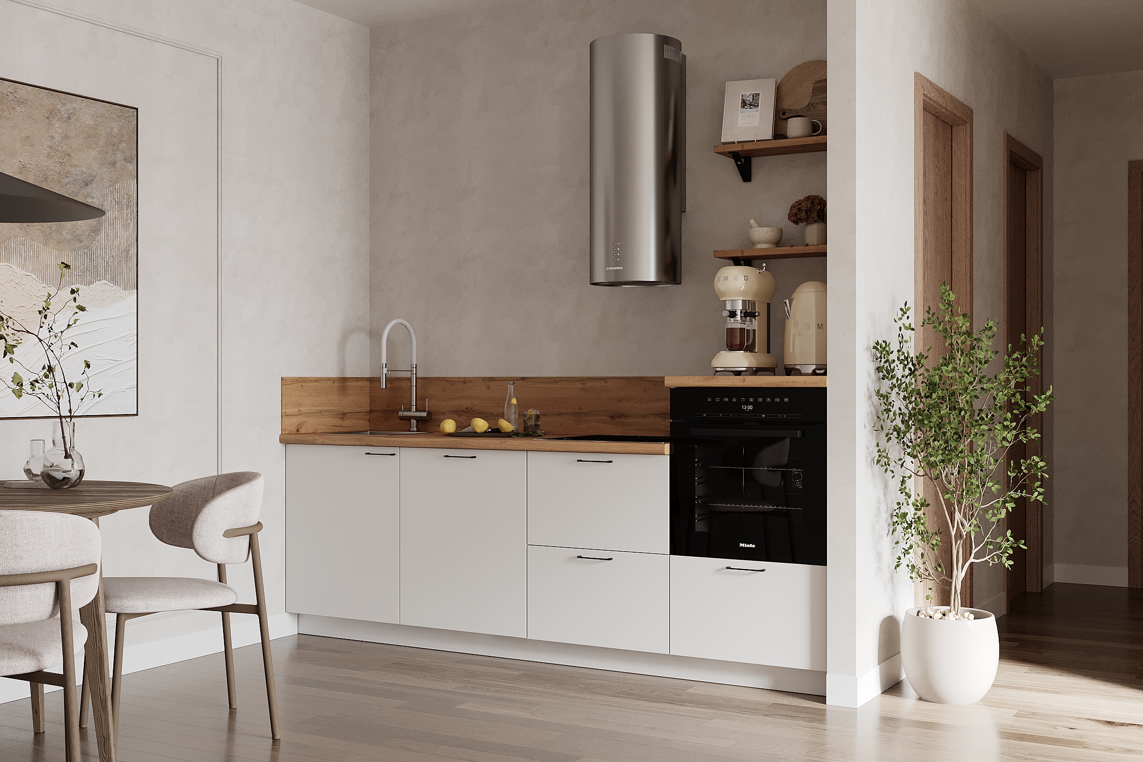 — Эстетика и зонирование: высокий модуль для духового шкафа делает интерьер аккуратным и современным.