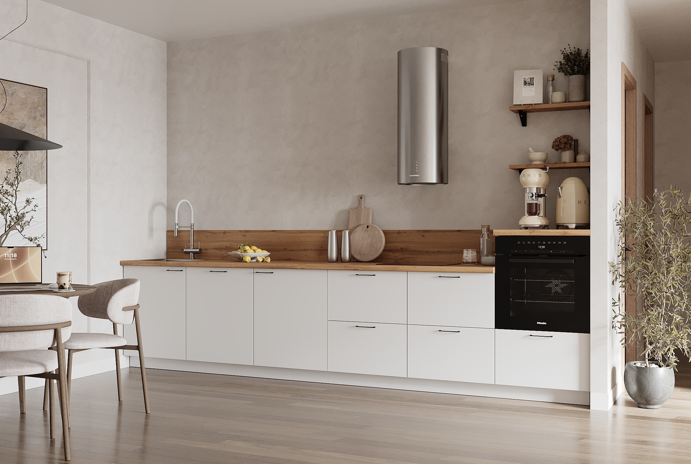 — Эстетика и зонирование: высокий модуль для духового шкафа делает интерьер аккуратным и современным.