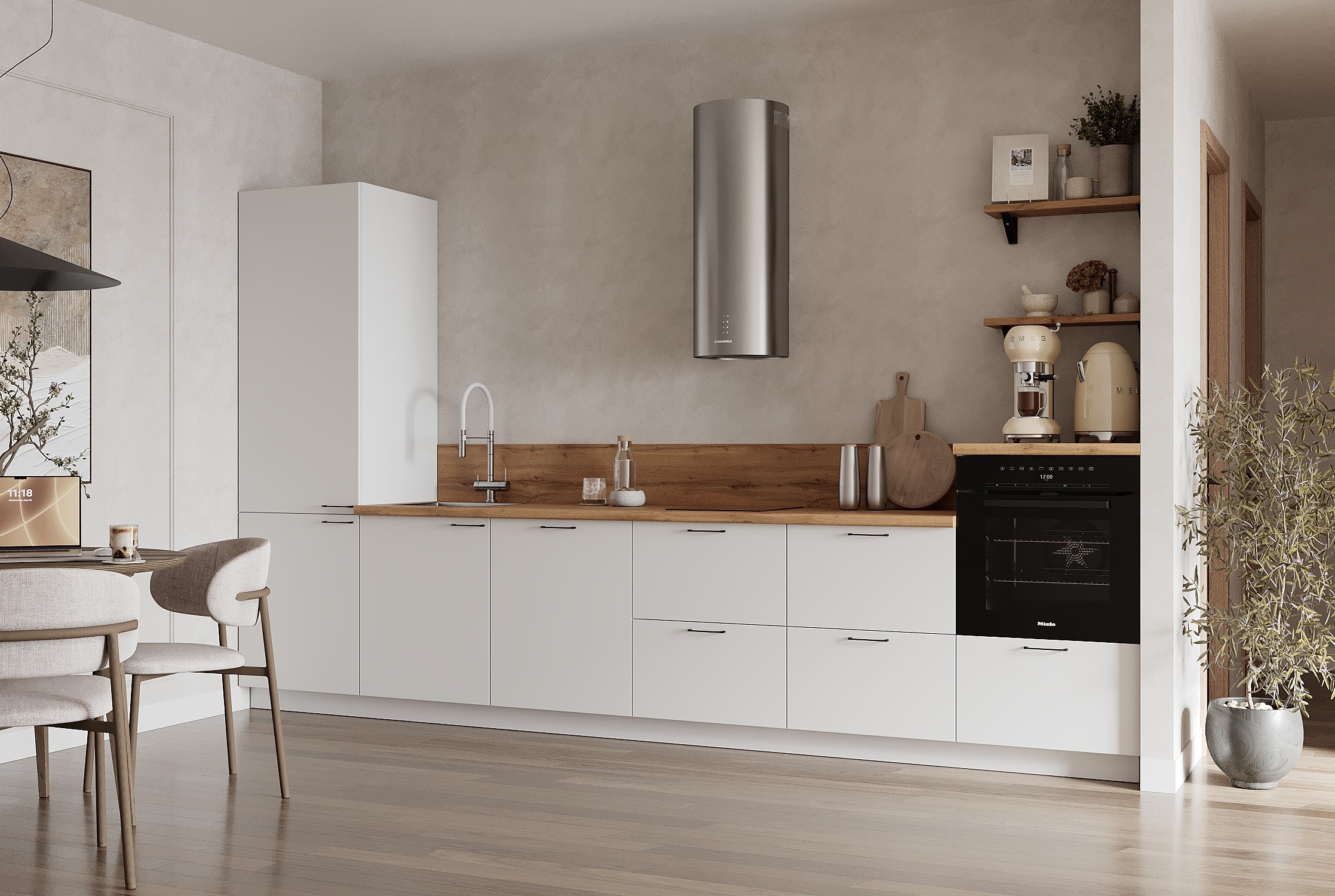 — Эстетика и зонирование: высокий модуль для духового шкафа делает интерьер аккуратным и современным.