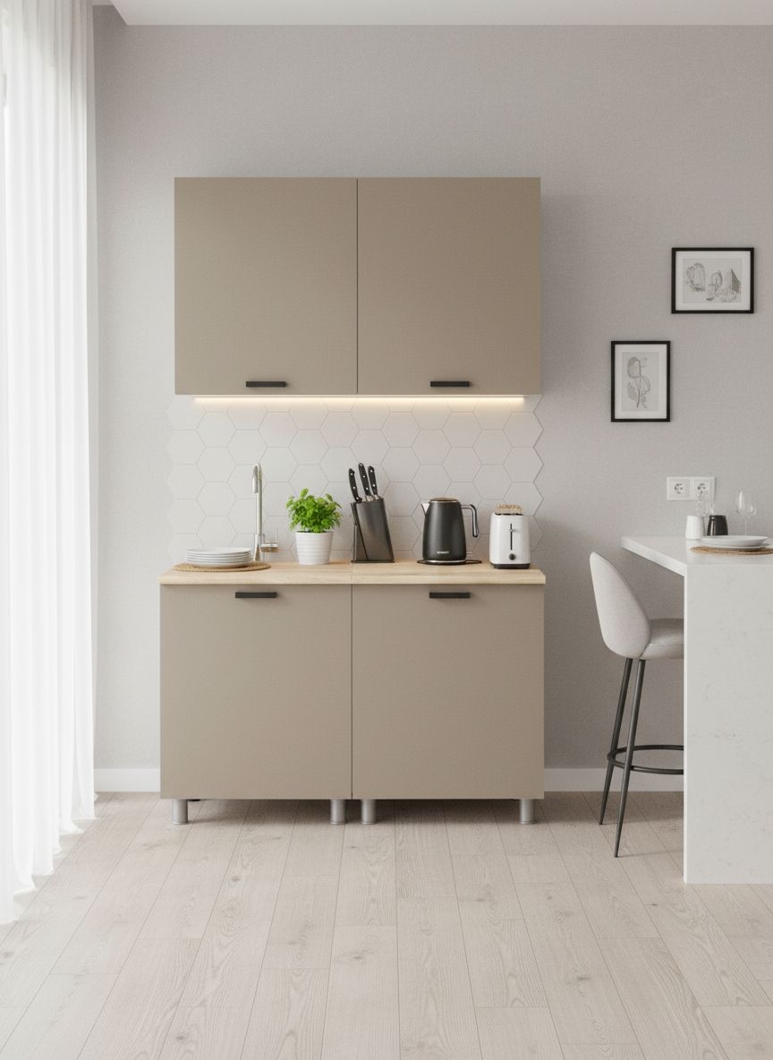 Материал устойчив к выцветанию и воздействию бытовой химии, прост в уходе и рассчитан на длительную эксплуатацию. Поверхность обладает повышенными гидрофобными свойствами, что делает кухню практичной и удобной для ежедневного использования.