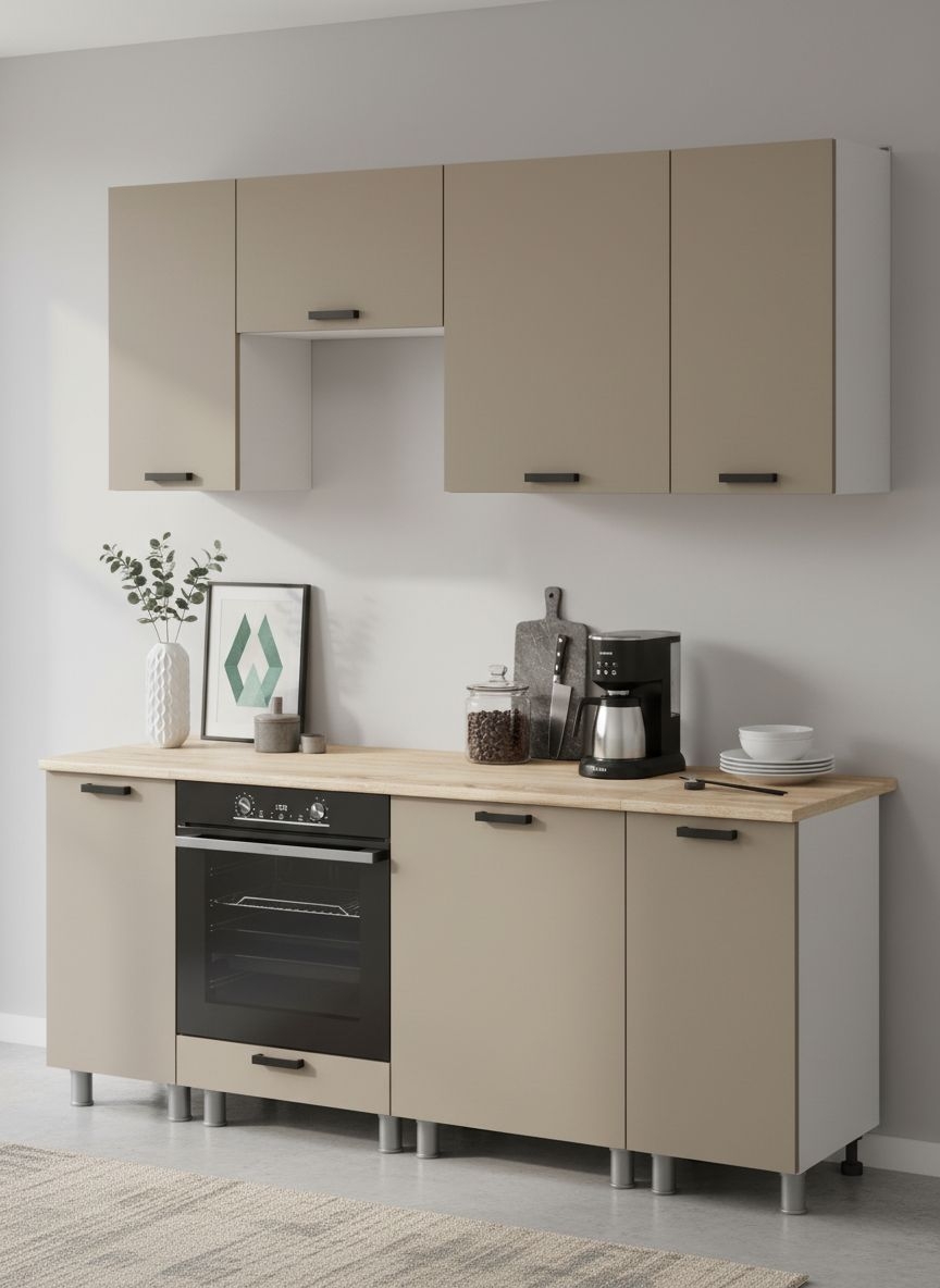 Фасады модульной кухни «Орешник» выполнены из современного пластика акрилит, который отличается прочностью, глубиной цвета и эффектным внешним видом. Торцы защищены ПВХ-кромкой 1 мм, что обеспечивает аккуратный вид и защиту от влаги и механических повреждений.
