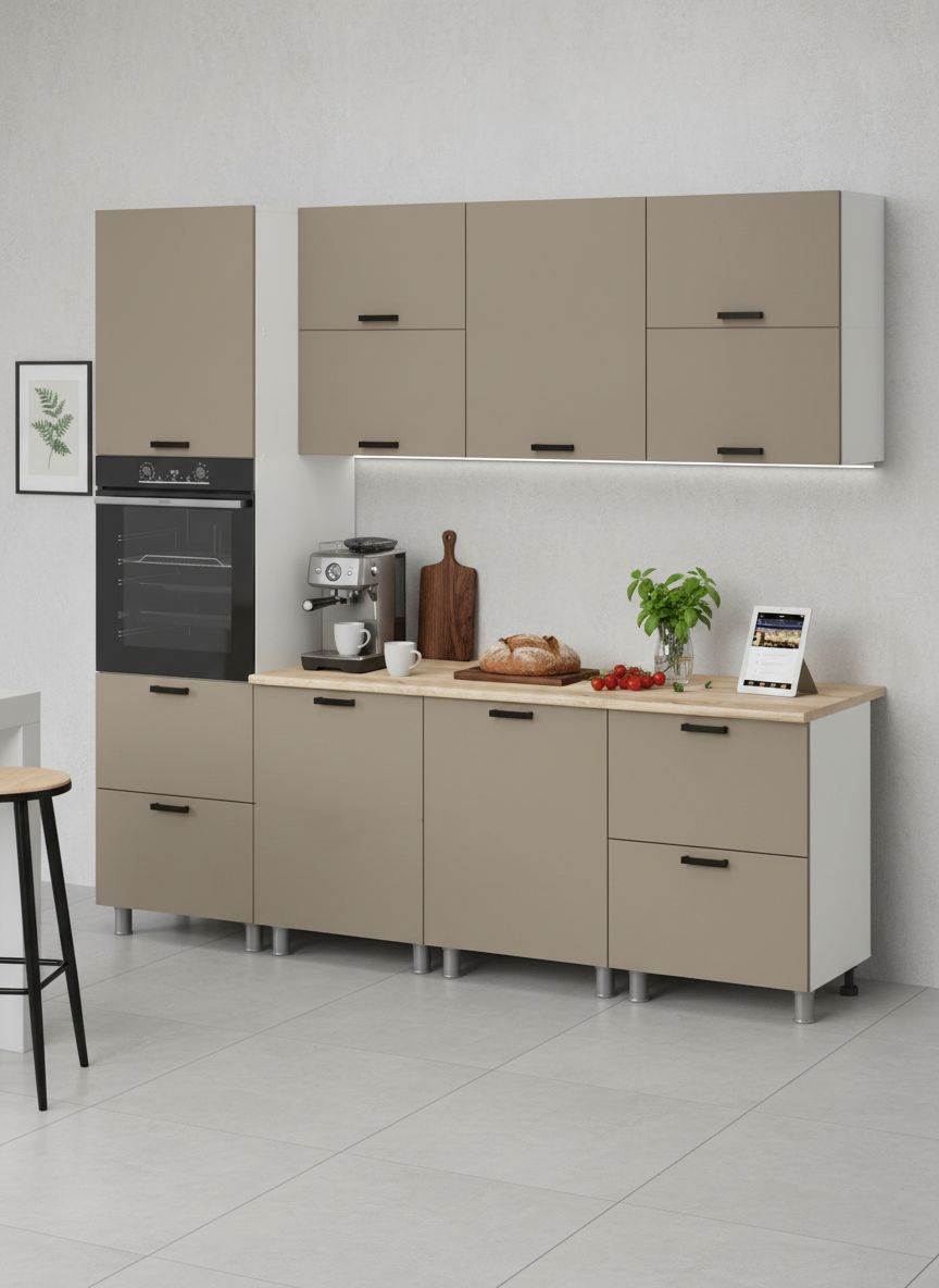 Фасады модульной кухни «Орешник» выполнены из современного пластика акрилит, который отличается прочностью, глубиной цвета и эффектным внешним видом. Торцы защищены ПВХ-кромкой 1 мм, что обеспечивает аккуратный вид и защиту от влаги и механических повреждений.