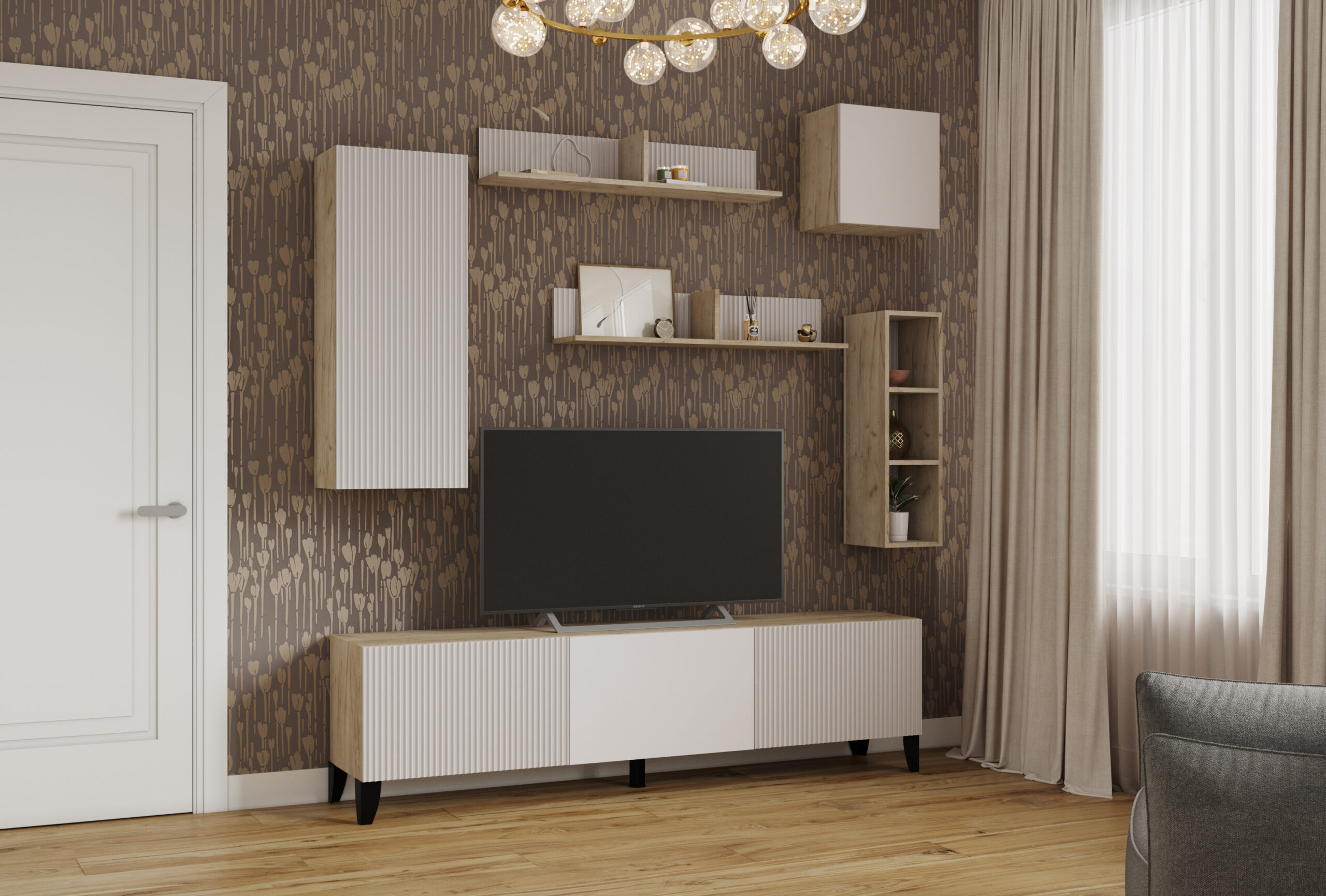Навесное исполнение позволяет эффективно использовать вертикальное пространство и сохранять ощущение порядка и простора в комнате. Шкаф гармонично сочетается с другими модулями серии «Сириния», помогая создать цельный и продуманный интерьер гостиной.