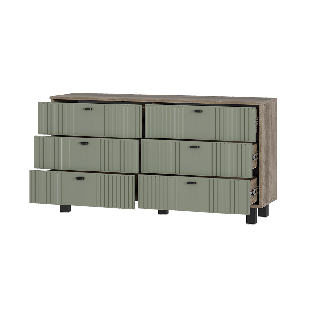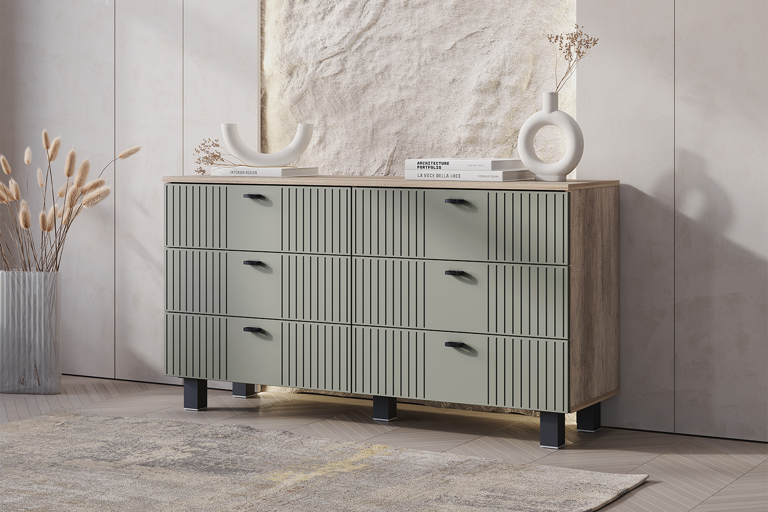 Комод «Олива» КМ-04— это элегантный и функциональный элемент для любого интерьера. Фрезеровка на фасадах создает интересные текстурные контрасты и визуальные акценты. Кроме того, этот элемент декора также помогает скрыть мелкие загрязнения, что упрощает уход за мебелью. Металлически накладные ручки на ящиках обеспечивают удобство в использовании.