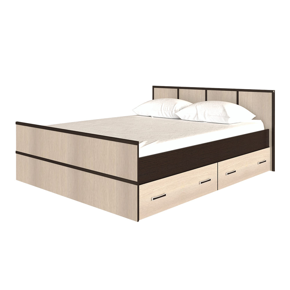 Двуспальная кровать «Сакура» выполнена из ЛДСП высокого качества в контрастных цветах «венге» и «лоредо». Данная модель оснащена двумя выдвижными ящиками, в которых можно хранить постельные принадлежности или любые необходимые вещи. Ящики находятся с одной стороны, но установить их можно с любой стороны. Изделие не имеет ножек, а значит избавит вас от скопления пыли под основанием.