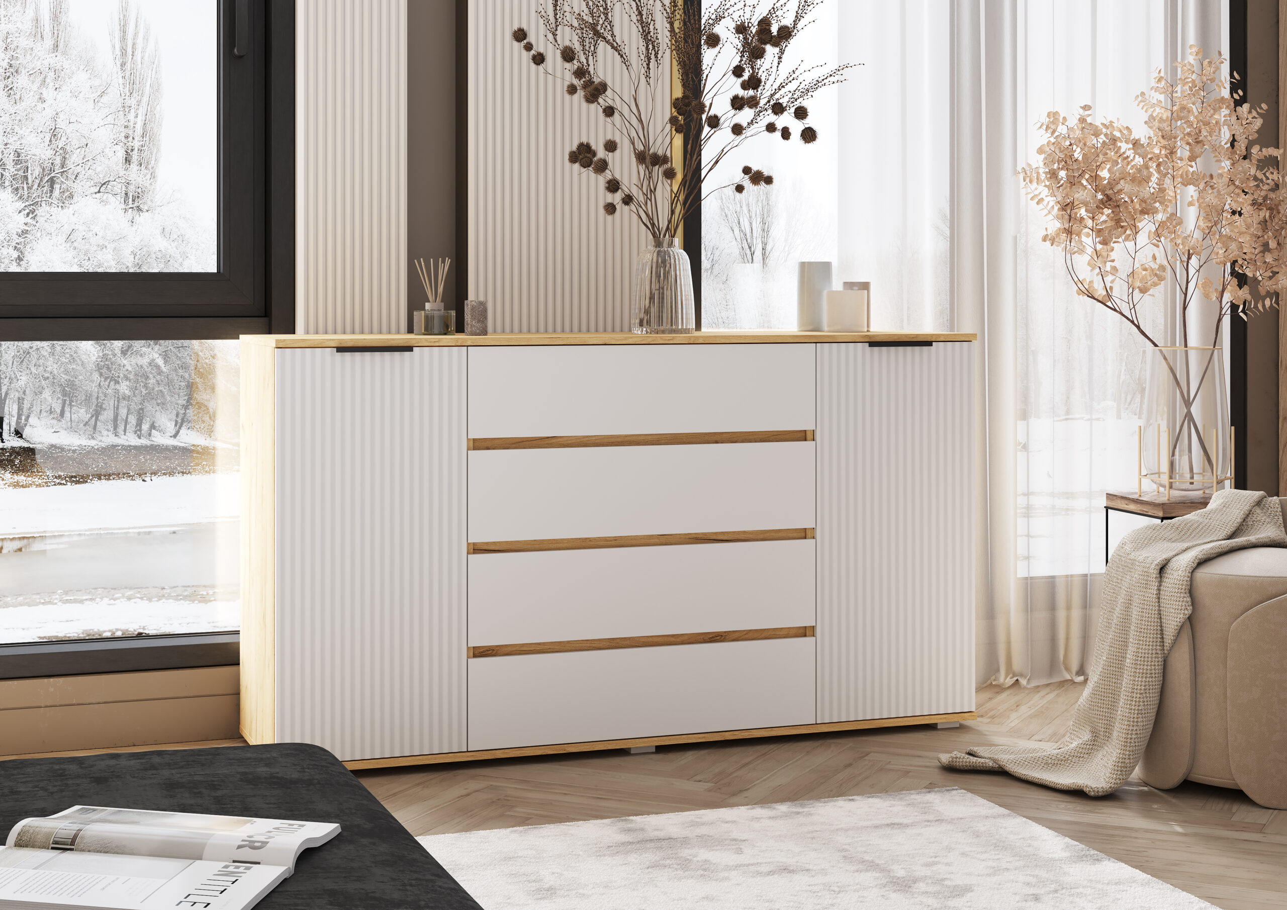 Марвэл Комод 2 двери 4 ящика (1600) (Браш Вайт, Дуб Крафт) - Фирменный интернет-магазин мебели «Арника»