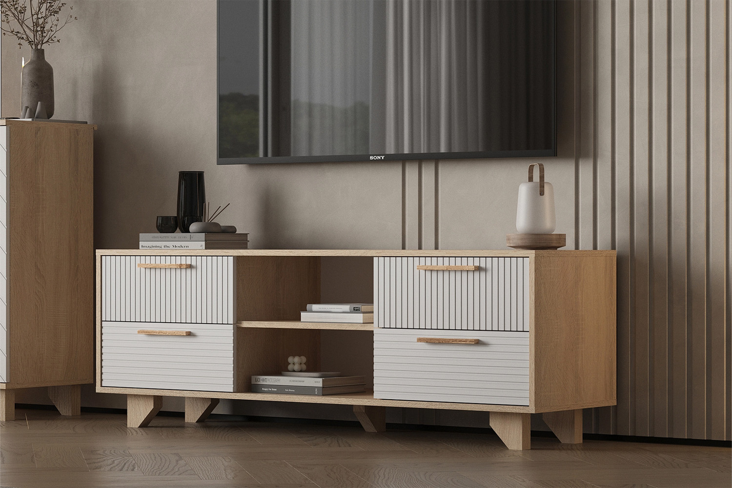 Ньёрд ТВ Тумба 1500.4 Дуб Сонома / Белый софт матовый - Фирменный интернет-магазин мебели «Арника»