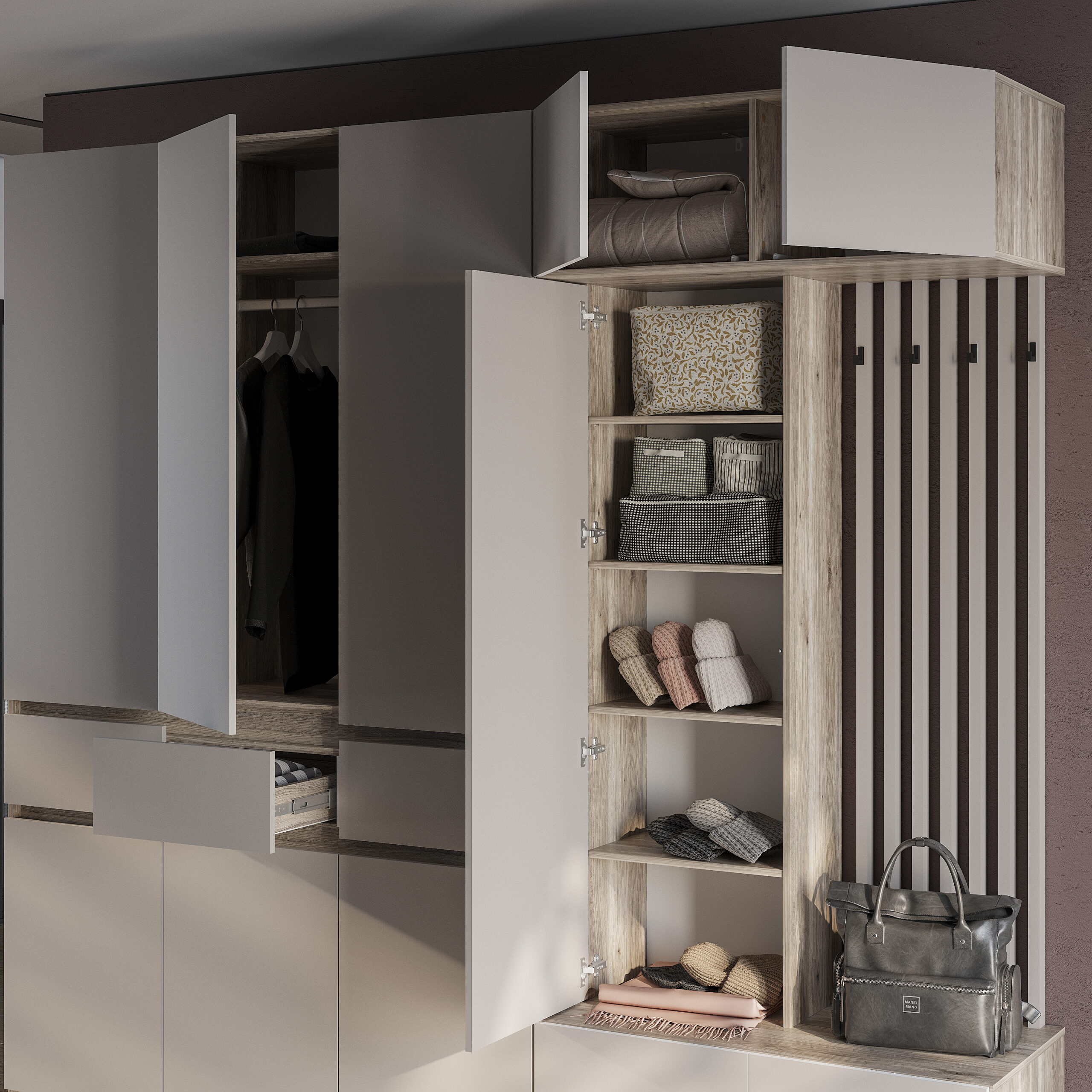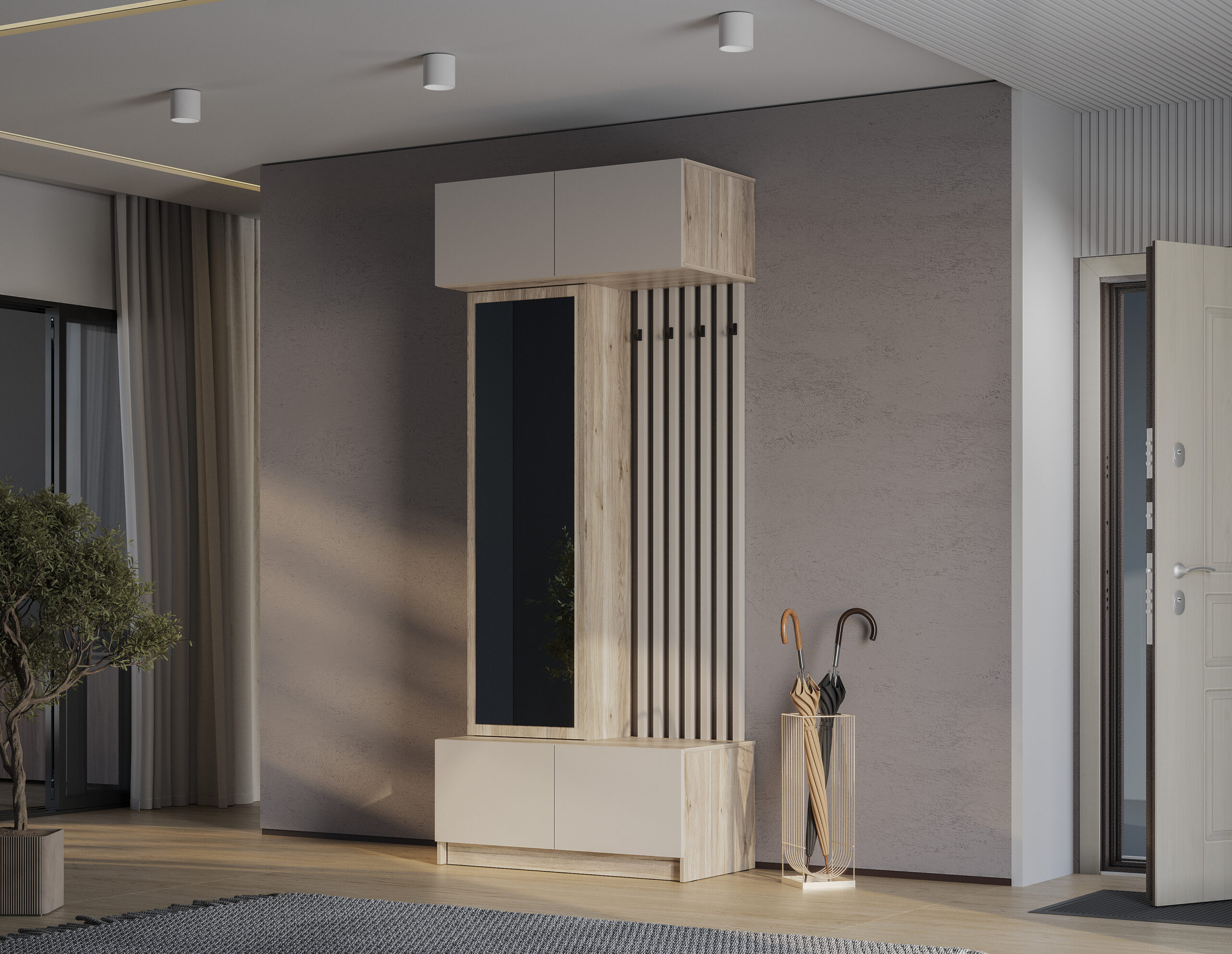 Стильная и компактная прихожая «Багира» – это оптимальное сочетание открытых и закрытых зон для хранения верхней одежды, головных уборов, обуви и аксессуаров.