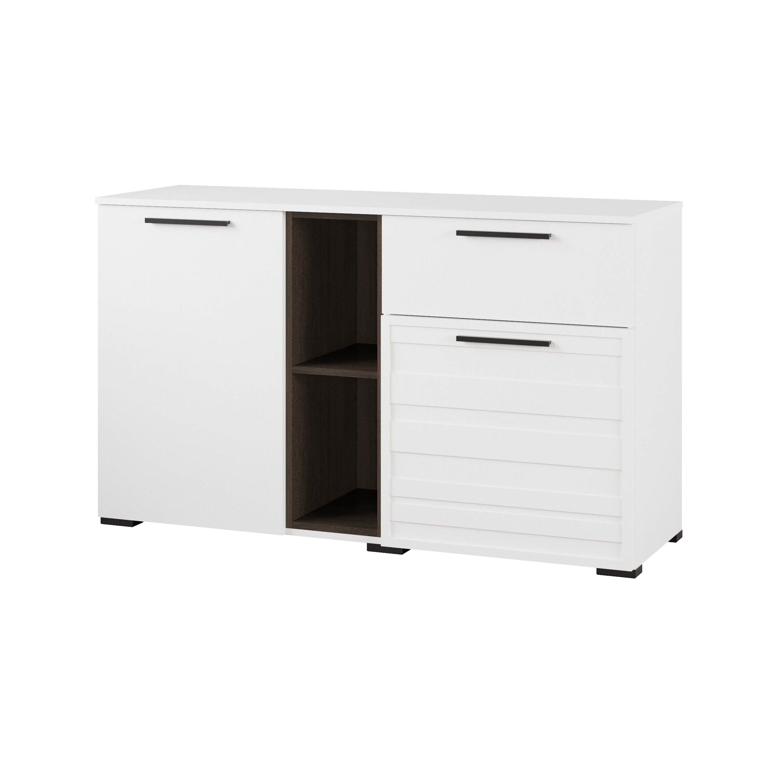 Комод — отличное решение для организации хранения в спальне. Комод из коллекции Модена привлекает своей вместимостью и разноплановым наполнением. Имеет 2 закрытые дверцами ниши, внутри которых расположены полки, один выкатной ящик и две открытые секции по центру. Контрастное сочетание декора ясень анкор светлый с темным венге дополнено черными тонкими ручками. Комод идеален для хранения вещей в сложенном виде, текстиля и белья, а также коробок с вещами.