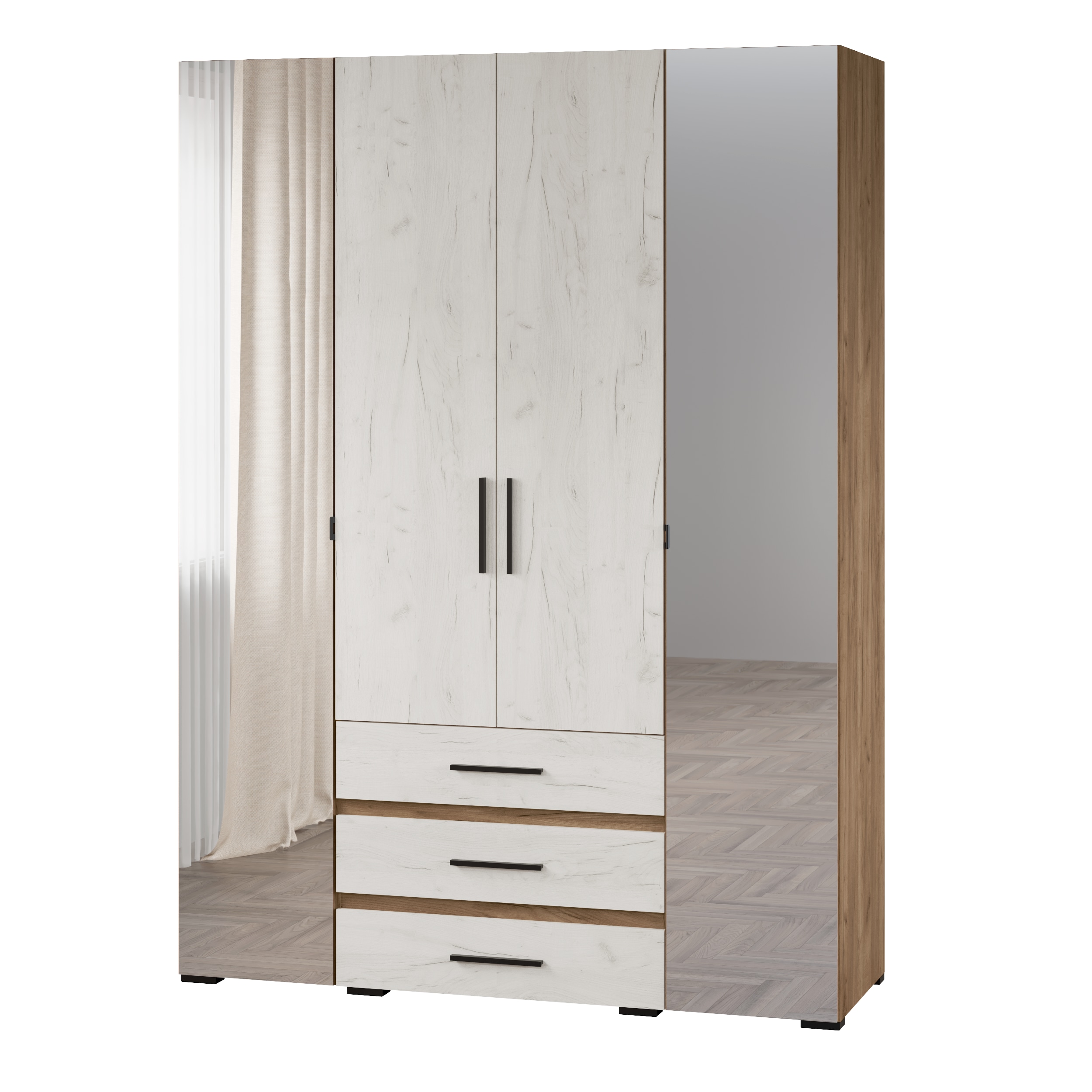 Организоваться комфортное хранение одежды и белья в спальне возможно, приобретя всего один шкаф Модена. Четырехдверный шкаф имеет две секции с полками для вещей в сложенном виде, секцию с продольной штангой для одежды на плечиках и три вместительных ящика для белья и аксессуаров. Украшают модуль зеркальные фасады, которые облегчают конструкцию шкафа и добавляют пространству легкости и «воздуха».