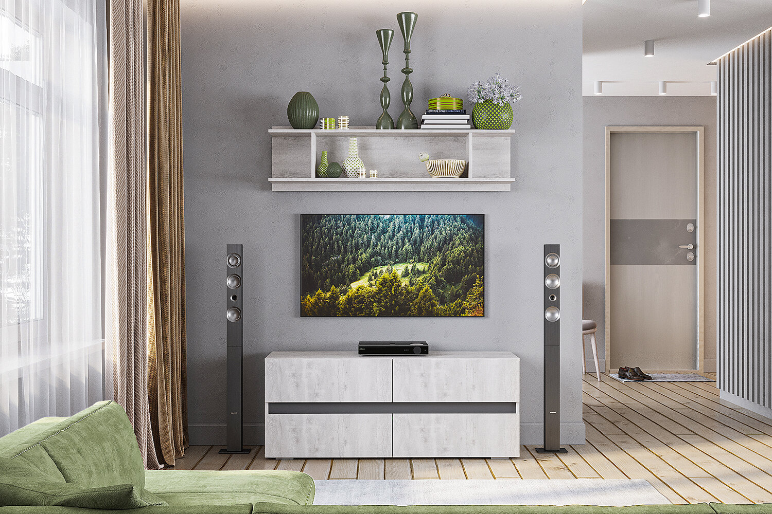 Современная компактная гостиная Мрия выполнена в трендовом цвете Бетон пайн светлый. Серия состоит из самого необходимого: тумба под ТВ, вместительные пеналы и открытая навесная полка, и позволит не загромождать комнату мебелью, а эффективно использовать пространство.
