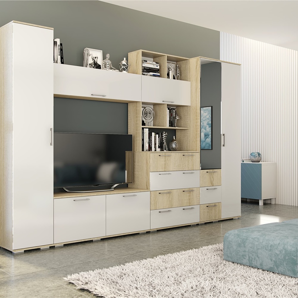 Пенал Белладжио — это стильный и качественный предмет интерьера. Он имеет внутреннее наполнение из двух полок и хромированной штанги для одежды на вешалках. Корпус выполнен в цвете «дуб сонома», а дверца — в белом цвете. Пенал не занимает много места и хорошо смотрится в светлом интерьере.