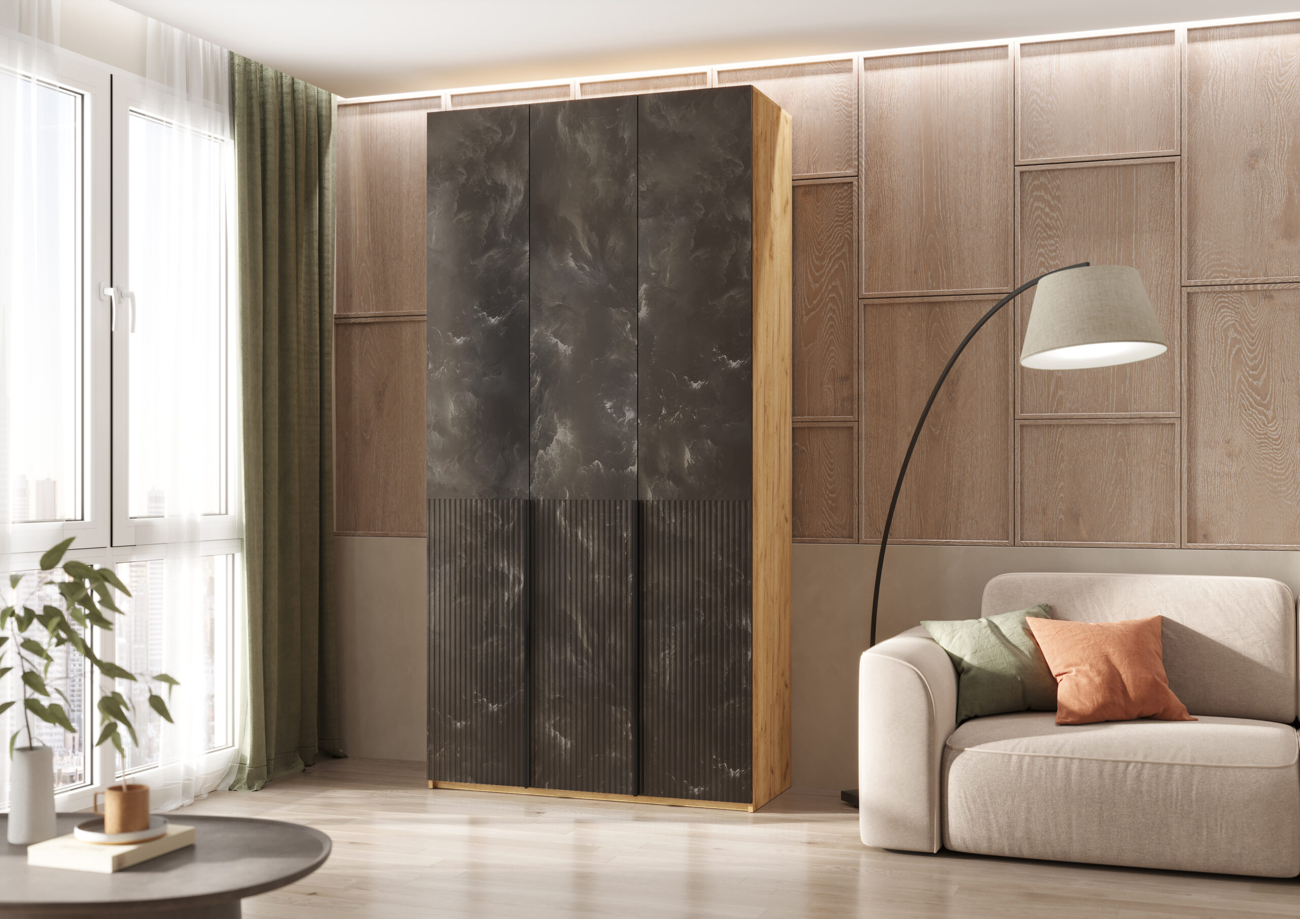 Шкаф трехстворчатый Марвэл — это стильное и функциональное решение для вашего интерьера. Его элегантный дизайн и современная отделка создают атмосферу свежести и простора. Этот шкаф оборудован удобными распашными дверьми с ручками.
